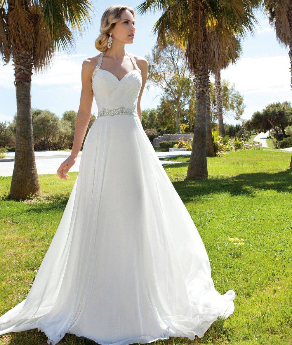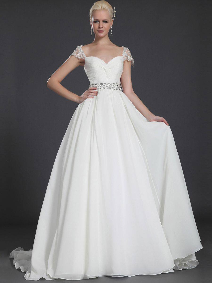 К воздушным шифоновым вариациям часто подбирают кружевной верх, украшают его камнями, стразами или жемчугом, делая его более массивным и ярким. Такое сочетание выглядит элегантно и благородно. Если вы хотите красивое не пышное платье — А-силуэт то, что нужно. Модель с рукавами скроет полноту рук и отлично подойдет для венчания.