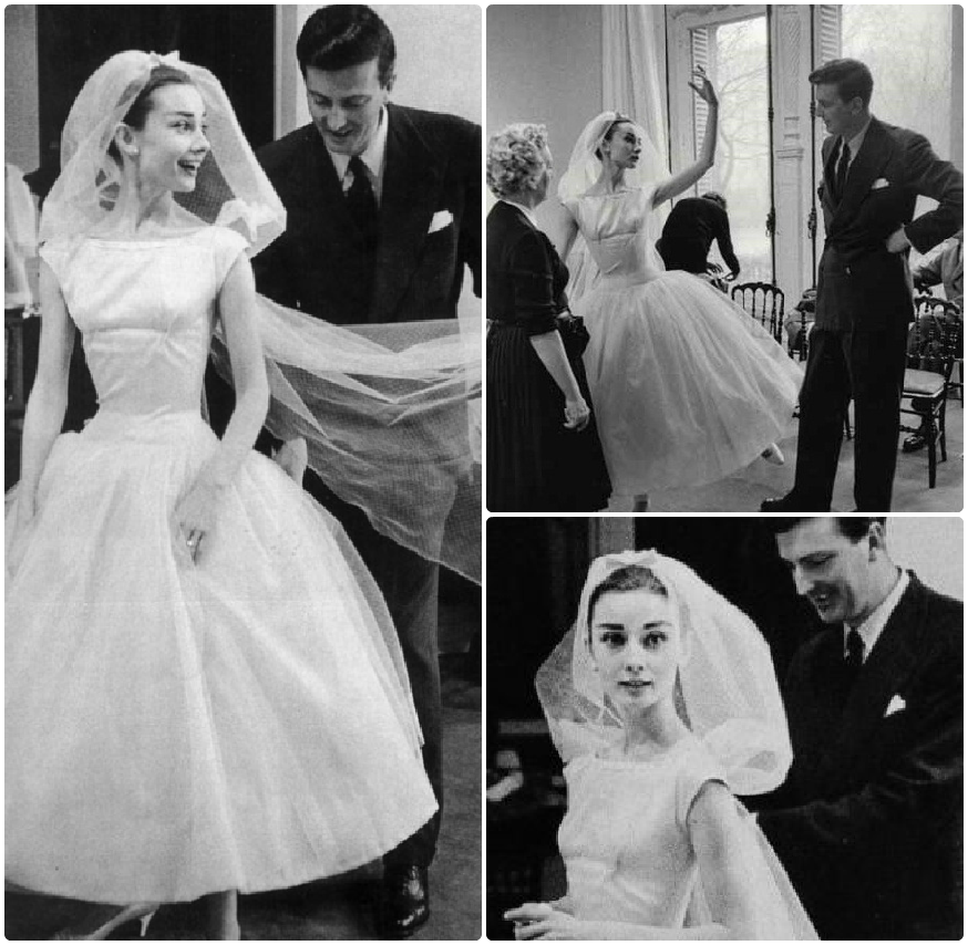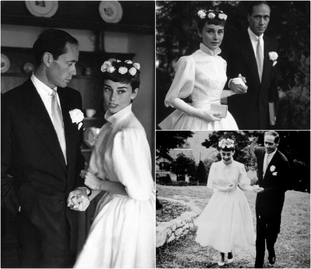 Свадебные наряды самой Одри были куда более удачными, чем ее браки. Оба официальных замужества актрисы закончились разводом. Первый раз Одри связала себя узами брака с известным голливудским актером Мелом Феррером. Их свадьба состоялась в Швейцарии в 1954 году и стала не только одним из самых ожидаемых событий в мире шоу-бизнеса, но и памятным моментом в истории моды. Эльфийский образ невесты придумал знаменитый французский кутюрье Пьер Бальмен. Возможно это белое платье длиной до щиколотки с воротником-стойкой, подчеркнутой талией и длинными шифоновыми рукавами не стало бы столь заметным явлением, если бы не милый венок из свежих цветов, украсивший голову невесты. Будь выбрана традиционная тиара с фатой или вуаль, образ не получился бы столь трогательным и романтичным.