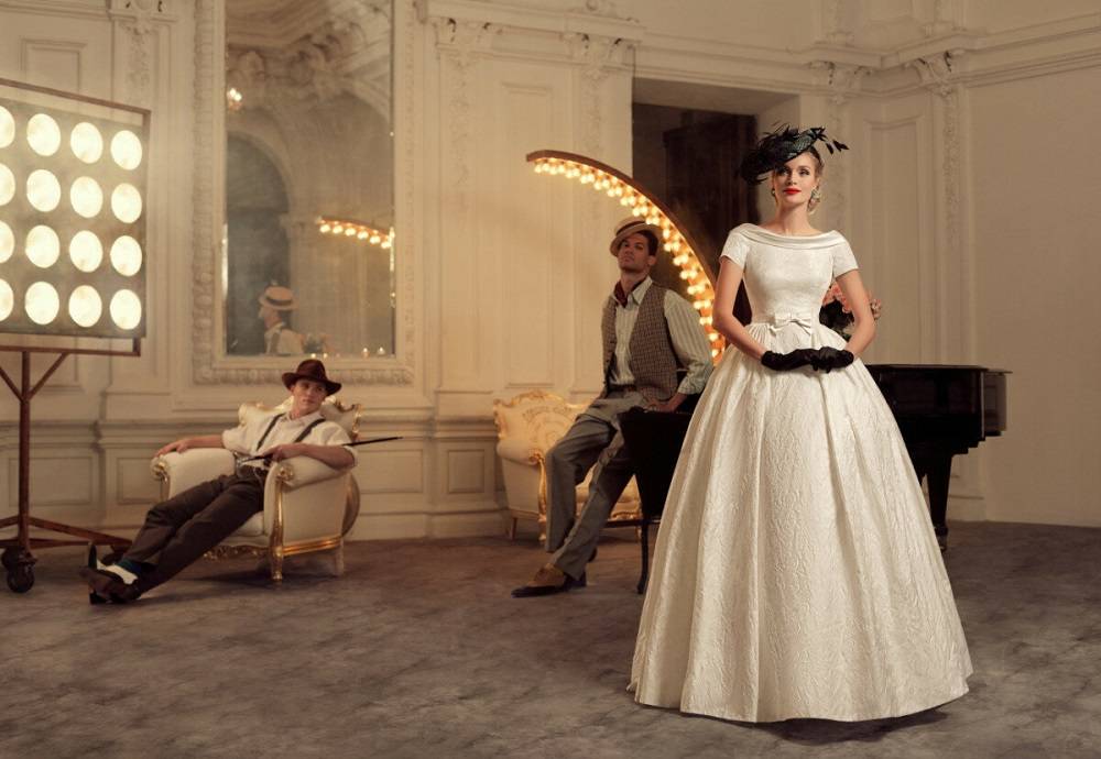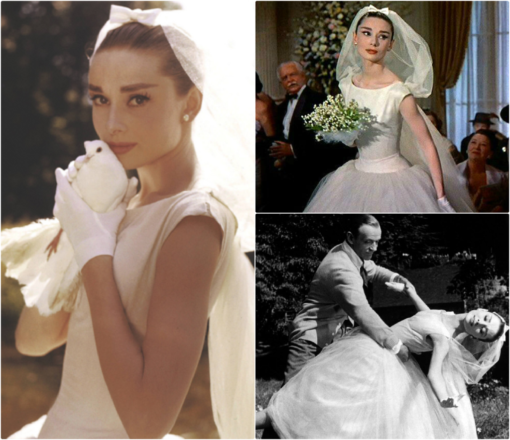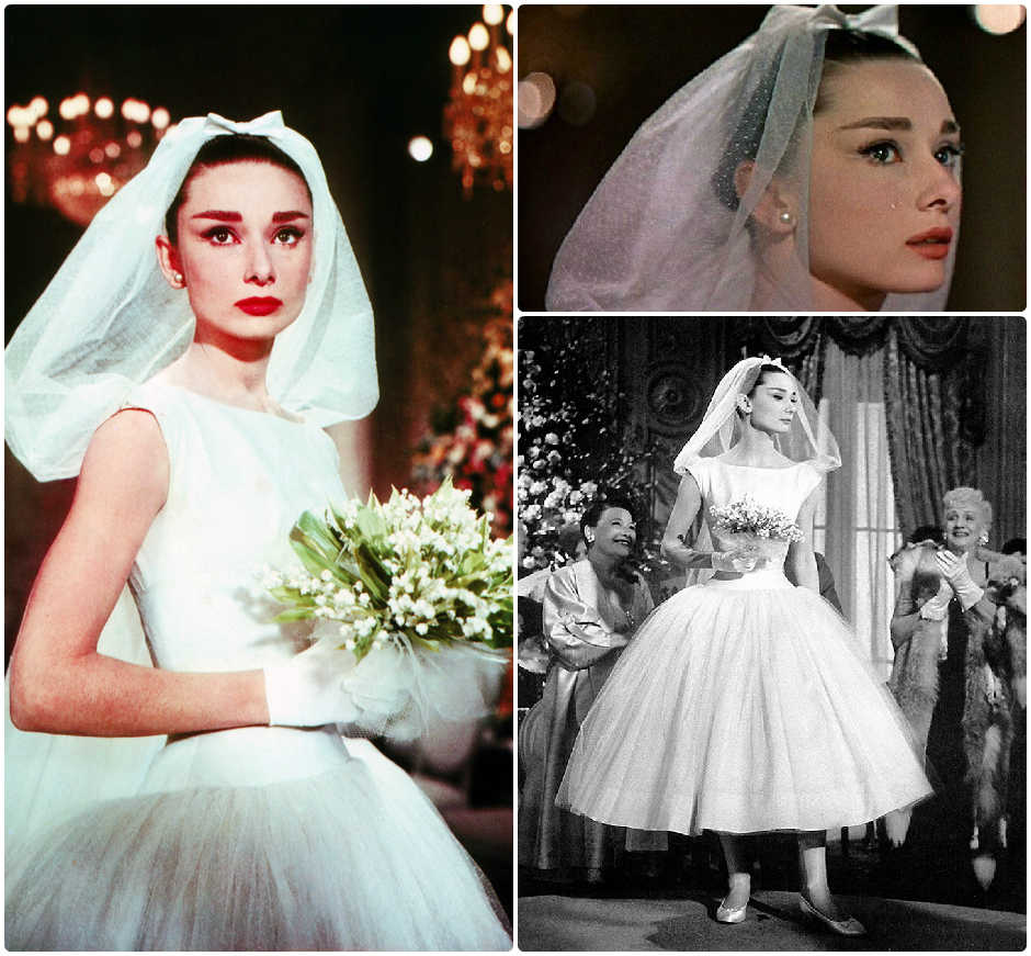 Лаконичное свадебное платье в стиле «new look» с пышной юбкой чайной длины и вырезом «Сабрина-декольте» (четырехугольный вырез платья, придуманный Живанши для нарядов Хепберн еще в их первом совместном фильме «Сабрина»), в котором героиня Одри появляется в сцене фотосъемки для журнала, стало самой популярной моделью среди невест конца 1950х — начала 1960х годов. Некоторую кукольность усиливает белый бант, к которому крепится фата из тюля. Особую изящность Джо-Одри придают короткие атласные перчатки и аккуратные туфельки на невысоком каблуке, так называемые kitten heels. Изначально обувь на каблуке от 3,5 до 5 см создавалась для юных девушек-подростков. Но со временем женщины всех возрастов по достоинству оценили два неоспоримых преимущества таких туфель – элегантность и удобство. И именно Одри на экране и в жизни способствовала популярности «кошачьих каблучков».