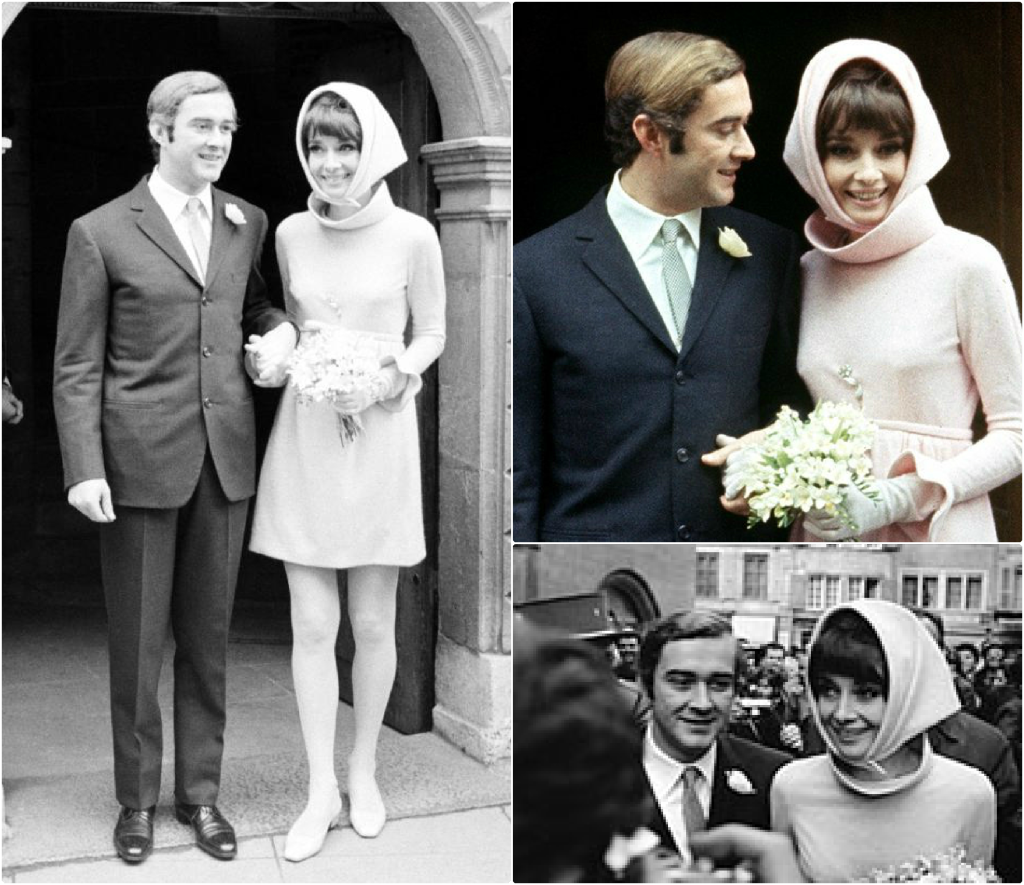 Для своей второй церемонии бракосочетания с итальянским психиатром Андреа Дотти Одри выбрала весьма оригинальный и при этом очень нежный наряд невесты, который подарил ей Живанши. Это пастельно-розовое платье из джерси с круглым воротником-стойкой,возможно, было слишком коротким для традиционного свадебного наряда, но зато вполне отвечало требованиям эпохи мини и позволило подчеркнуть стройные ноги актрисы в бледно-розовых колготках. В тон платью — косынка из того же материала (классический для 60-х аксессуар) и изящные туфли на плоской подошве. Дополнил этот нежно-зефирный образ букет невесты, составленный из бледно-розовых фрезий и ландышей.