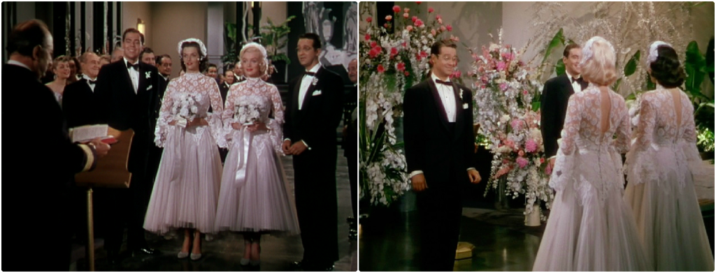 На героинях — платья в актуальном для 1953 года стиле «new look» с пышной юбкой чайной длины («tea length» — длина до середины голени или по щиколотку). Очень нежно смотрятся лиф из цветочного кружева с высоким горлом и длинные кружевные рукава в форме колокола. Венчают образы невест идентичные изящные белые шляпки с вуалью. Кстати, сама главная блондинка Голливуда выходила замуж три раза. Но культовым стал только один свадебный наряд Монро, который она выбрала для церемонии бракосочетания с легендарным бейсболистом Джо ДиМаджио, ставшим ее вторым мужем. Мэрилин не стала прибегать к услугам знаменитых кутюрье, а приобрела всего за $225 в универмаге Беверли-Хиллз скромный шерстяной костюм темно-коричневого цвета c воротником «Питер Пен» из белой норки и пуговицами со стразами. Знаменательно, что в 1999 году этот наряд Монро ушел с аукциона Sotheby’s уже за совсем другие деньги — $33, 350.