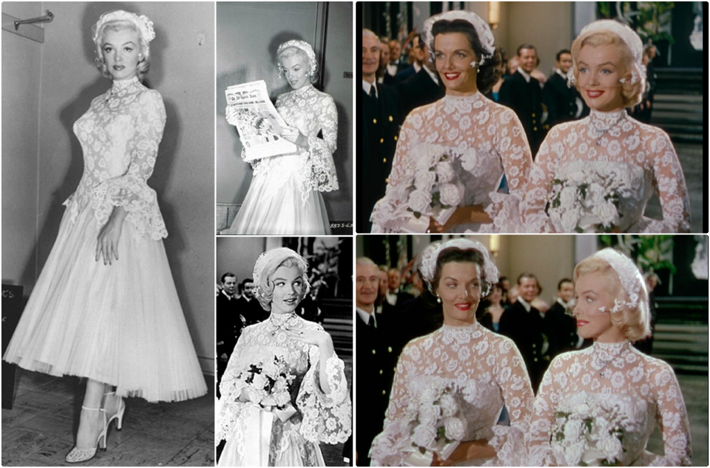 Что может быть лучше, чем свадьба в конце фильма? Правильно – двойная свадьба. Двум подругам-артисткам ревю в исполнении роскошной брюнетки Джейн Рассел и обворожительной блондинки Мэрилин Монро в финале знаменитой музыкальной комедии «Джентльмены предпочитают блондинок» удается-таки «повести к алтарю» достойных джентльменов. Делают это они в одинаковых свадебных нарядах, которые придумал известный голливудский художник по костюмам Уильям Травилла. Травилла сотрудничал с Монро на 8 лентах и дружил с актрисой долгие годы.