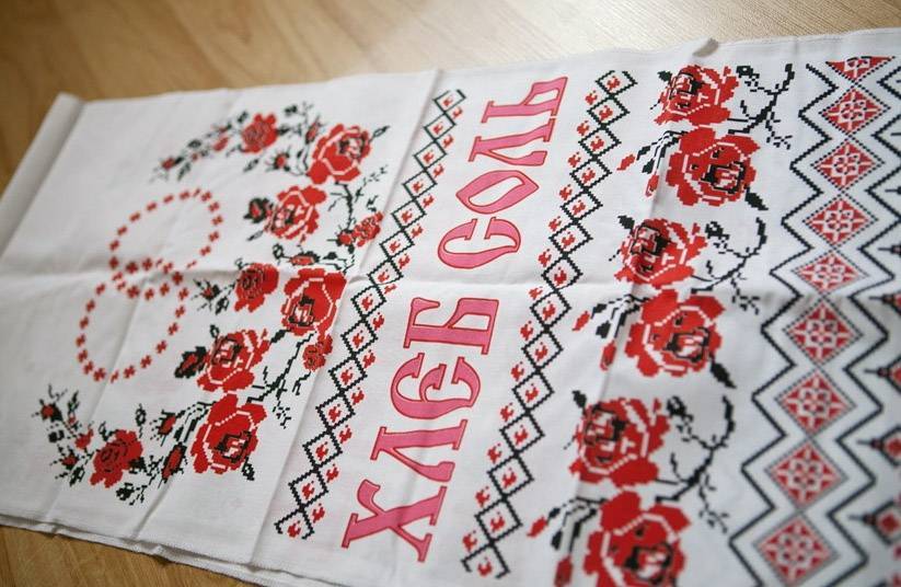 Хлебосольный рушник. На него кладут свадебный каравай, которым родители встречают молодых после ЗАГСа. На полотне вышивают пару голубей, лебедей или жаворонков, по бокам рушника вышиваются растительные орнаменты – символ процветания и благополучия, цветы, деревья, свадебные кольца.
