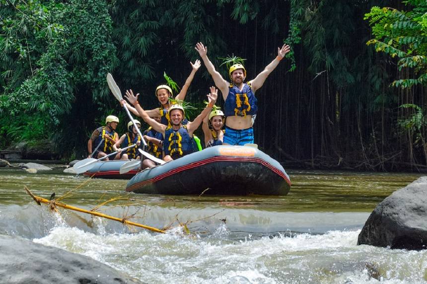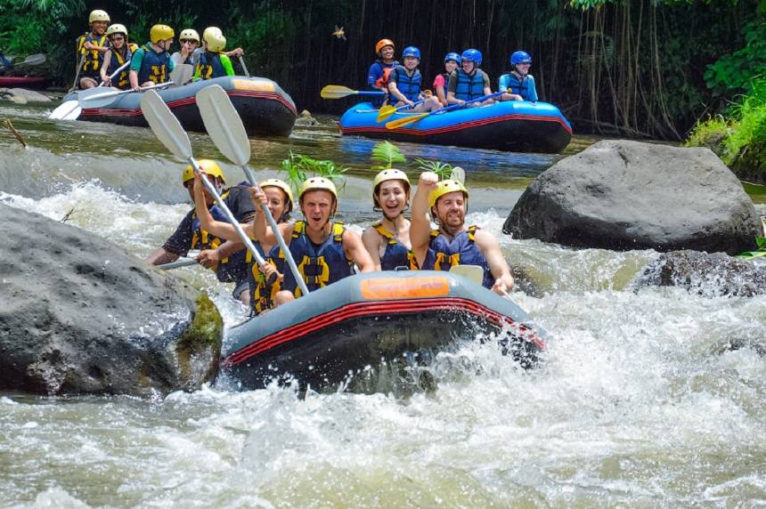 Теперь немного в активный отдых, на повестке раздела – рафтинг. Мы не может не затронуть тему адреналина, когда говорим про ТОП-15 лучших развлечений Бали. Рафтинг устраивается по двум рекам острова – Аюн и Теладжа Вайя. Рафтинг на реке Аюн более крутой, он более живописный. На пути встречаются красивейшие каньоны, водопады, пороги. Аюн более спокойная река, чем Теладжа Вайя, и спуск здесь больше не для спортивного интереса, а для развлечения. Кстати, к спуску допускают детей старше 8 лет.