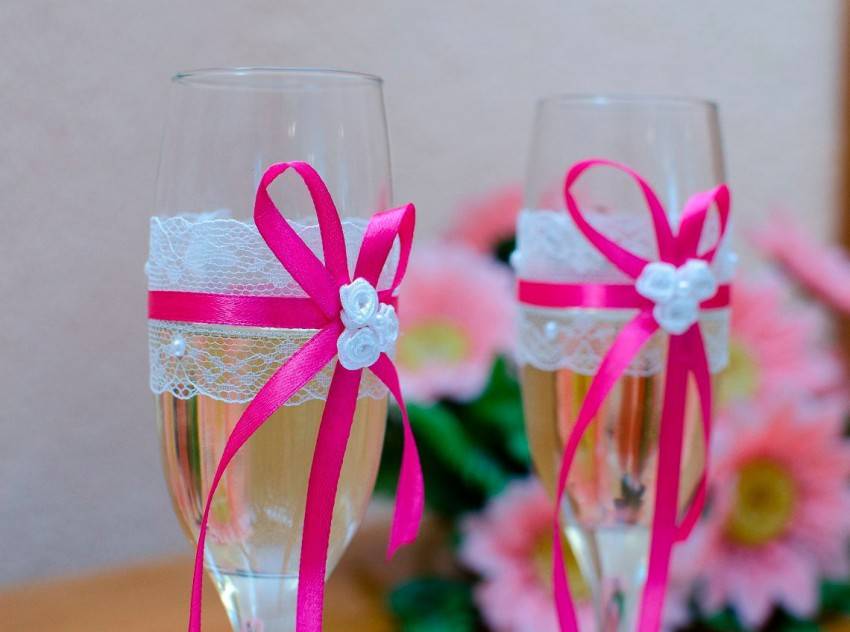 Лент и кружева. Для создания такого дизайна понадобится качественный клей, с помощью которого мелкие элементы и концы ленточек будут фиксироваться на стенках фужеров. Это может быть силикатный клей, ПВА, Момент. Но и обычный клеевой пистолет тоже гарантирует надежную фиксацию. Для начала бокалы моют в теплой воде с добавлением специального средства, затем просушивают и натирают. Далее наружную поверхность стенок фужера следует тщательно обезжирить, чтобы клей хорошо ложился на стекло. Если планируется украсить весь бокал, не исключая ножки, то начинать работу нужно именно с нее