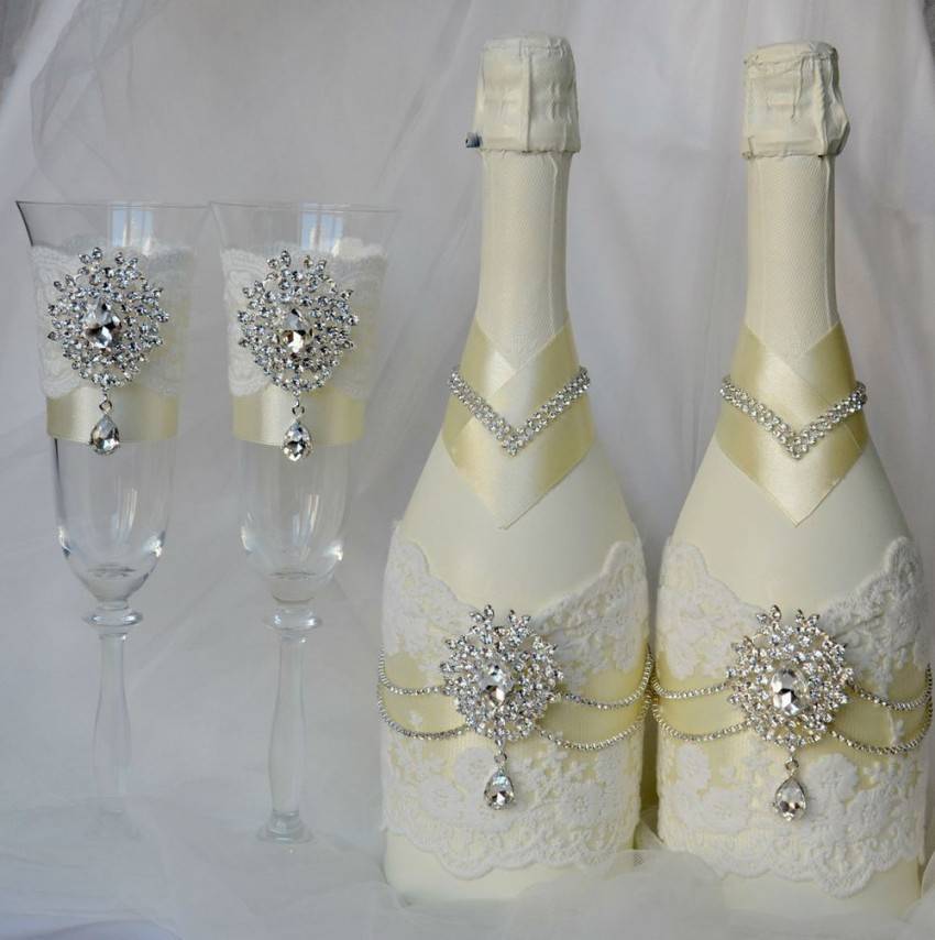 Кружева играют важную роль в оформлении этой посуды для торжества, поскольку являются символом нежности, невинности, хрупкости и невероятной красоты. Для проделывания такой работы вам не потребуются какие-то специальные навыки. Достаточно приобрести привлекательный ажурный материал и применить его для обертывания бокала. Все это фиксируется посредством клея. Можно собрать декорации в «юбку», что создаст для бокала еще более симпатичный облик. Шелковый бант или элемент из атласа сделает этот образ максимально дополненным.