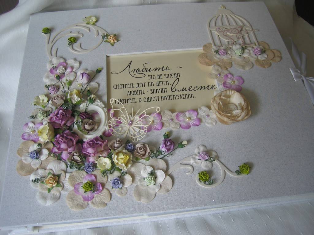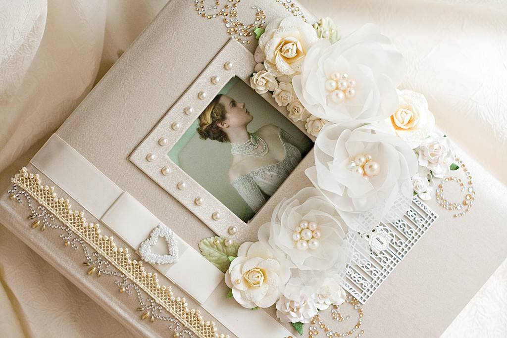 Во — первых, переплет и обложка должны быть крепким, хорошо скрепленным, а лучше всего – прошитым. Ведь он получится довольно увесистым и толстым. Обложки магазинных фотокниг делают из искусственной или натуральной кожи, бархата, шелка. Каждая пара выбирает на свой вкус. В альбом должно вместиться как минимум 50-60 снимков. Обложка должна быть плотной толстой с экраном для фото молодоженов. Мастер – класс дает множество вариантов. Если ваш свадебный альбом своими руками будет храниться на почетном месте, а не в шкафу в кипе других книг, первую обложку можно украсить цветами, кружевом, выложенными жемчужными бусинами сердцами или кольцами.