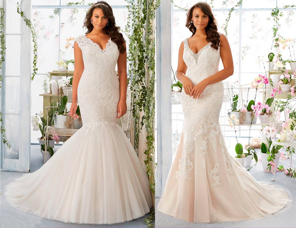 Среди возможных вариантов свадебных платьев для полных фигурирует и фасон «русалка». Он подойдет девушкам с типом фигуры «перевернутый треугольник». Платье сделает ее изящной