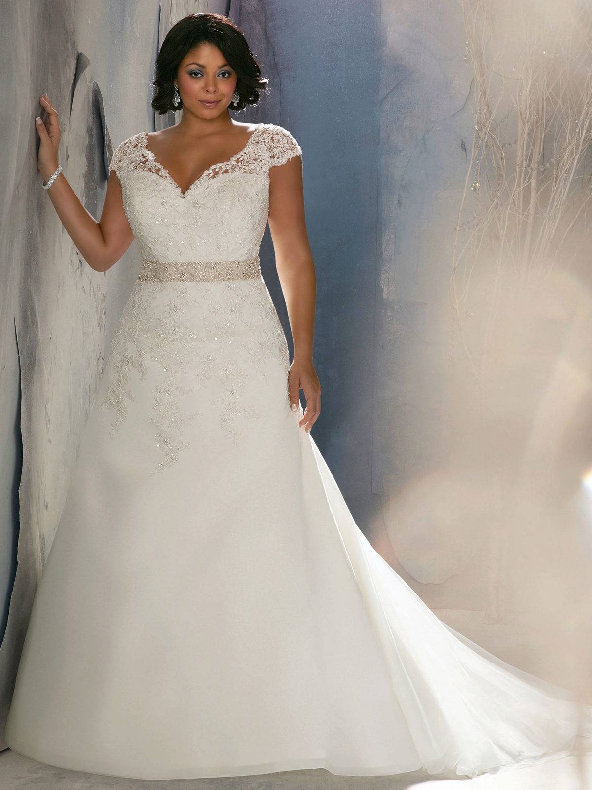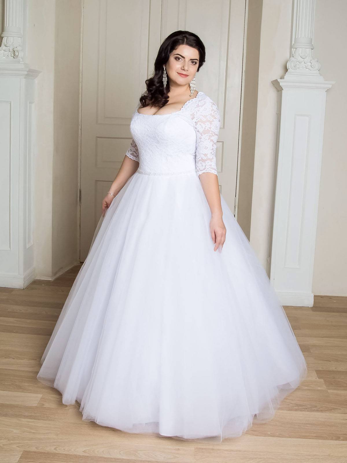 Невестам размера плюс сайз, стоит отказаться от корсетов, которые только подчеркнут лишние килограммы. Для полных женщин прекрасно подойдут фасоны A-образного силуэта, с V-образным вырезом. Юбка клёш всегда будет скрадывать живот и пышные бедра, убирать недостатки фигуры и формировать утонченный грациозный облик. В качестве отделки можно выбрать кружево, оно поможет создать миловидный, чистый и непорочный образ.