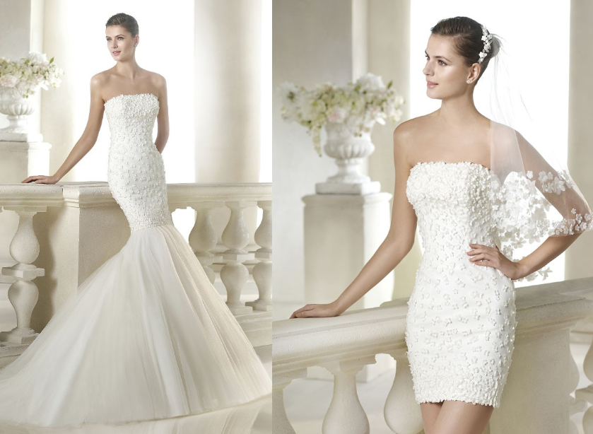 Очень удобна конструкция «трансформер». Фактически это приобретение двух изделий вместо одного. «Хвост» со шлейфом отстегивается и остается платье-футляр длиной чуть выше или ниже колена. Новобрачная может провести церемонию в полном облачении, а во время торжества или на второй день остаться в более комфортном варианте.