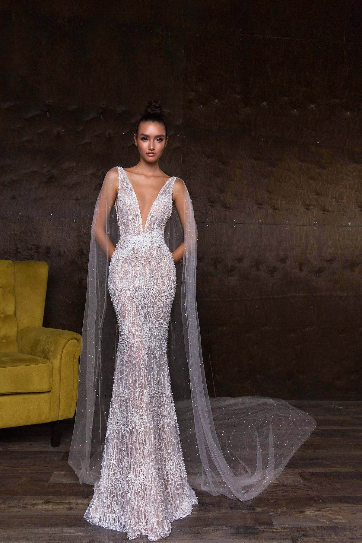Платье с длинными рукавами и полностью закрытое сверху делает образ новобрачной невинным и скромным. Он идеально подходит для венчания в церкви, где декольте и обнаженная спина неуместны.