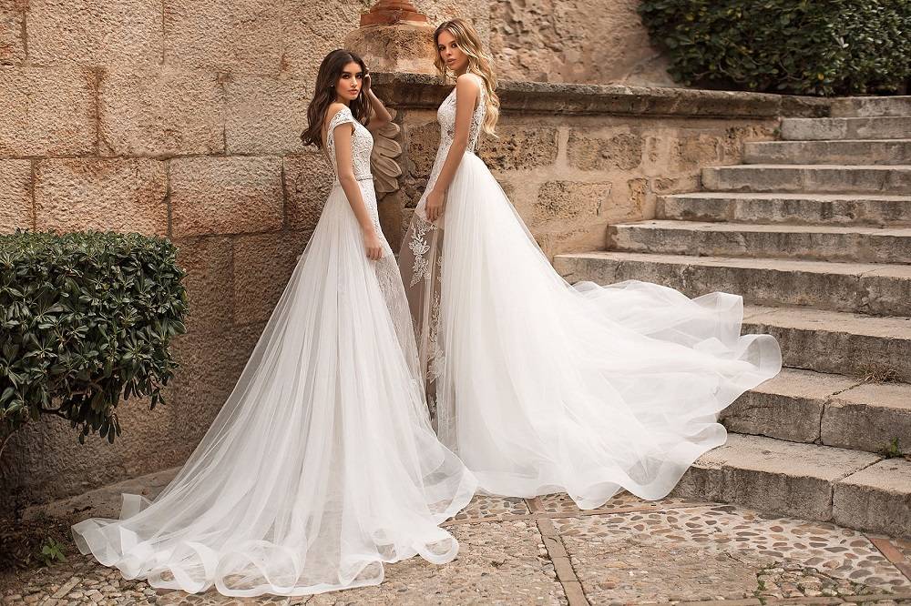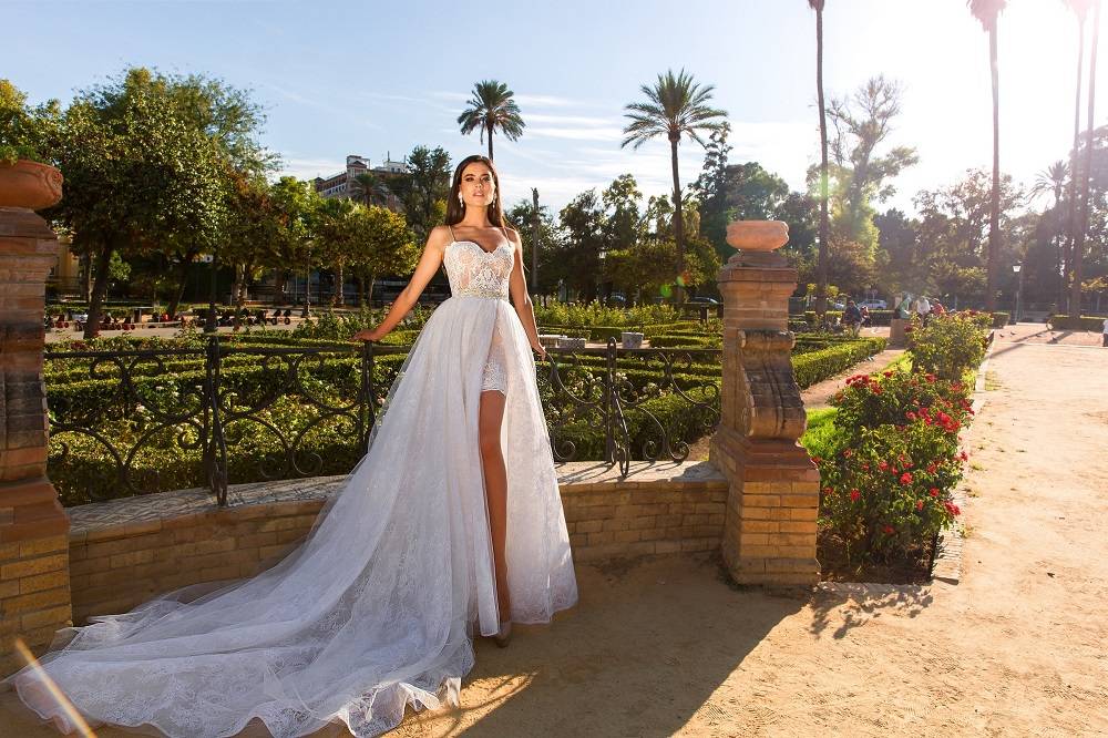 Свадебное платье с пристегивающейся юбкой-шлейфом называют трансформером. Декоративный элемент можно снять в любой момент. Многослойная юбка делает образ воздушным. Без нее наряд становится минималистичным.