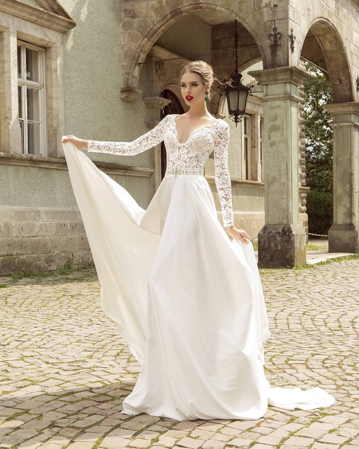 - Rosa Clara – роскошные из белоснежного шелка или атласа, с бантом на поясе, открытой спиной и шлейфом.