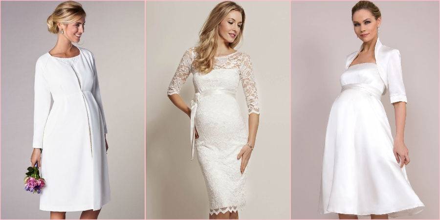 Совет. Если желаете скрыть немного располневшие руки при беременности, то на помощь придет свадебное болеро либо модели с рукавами.