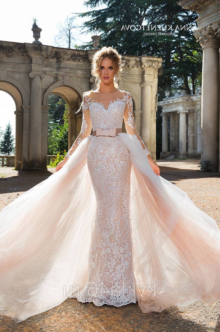 В предстоящем сезоне свадебные платья с длинными кружевными рукавами особенно актуальны. Для фасона рыбка подойдут рукава любой длины и формы: узкие до кистей, три четверти или до локтя, короткие облегающие или фонариком, расклешенные, присборенные у манжет, реглан или с разрезами. Если форма плеч и рук красивая, выберите модель с драпировкой вместо рукавов. Для наряда с плотной гладкой тканью рукава допускаются как из аналогичного материала, так и прозрачные.