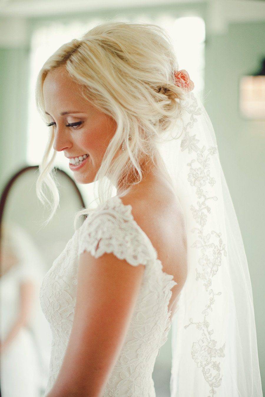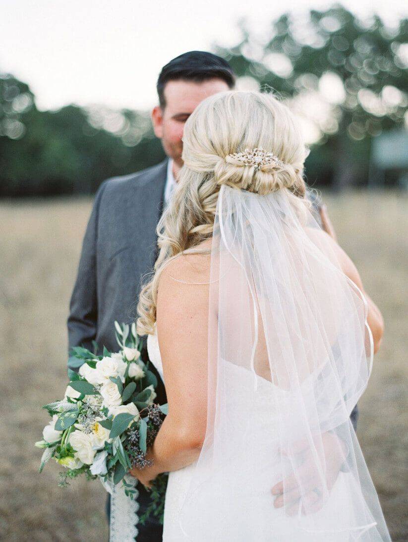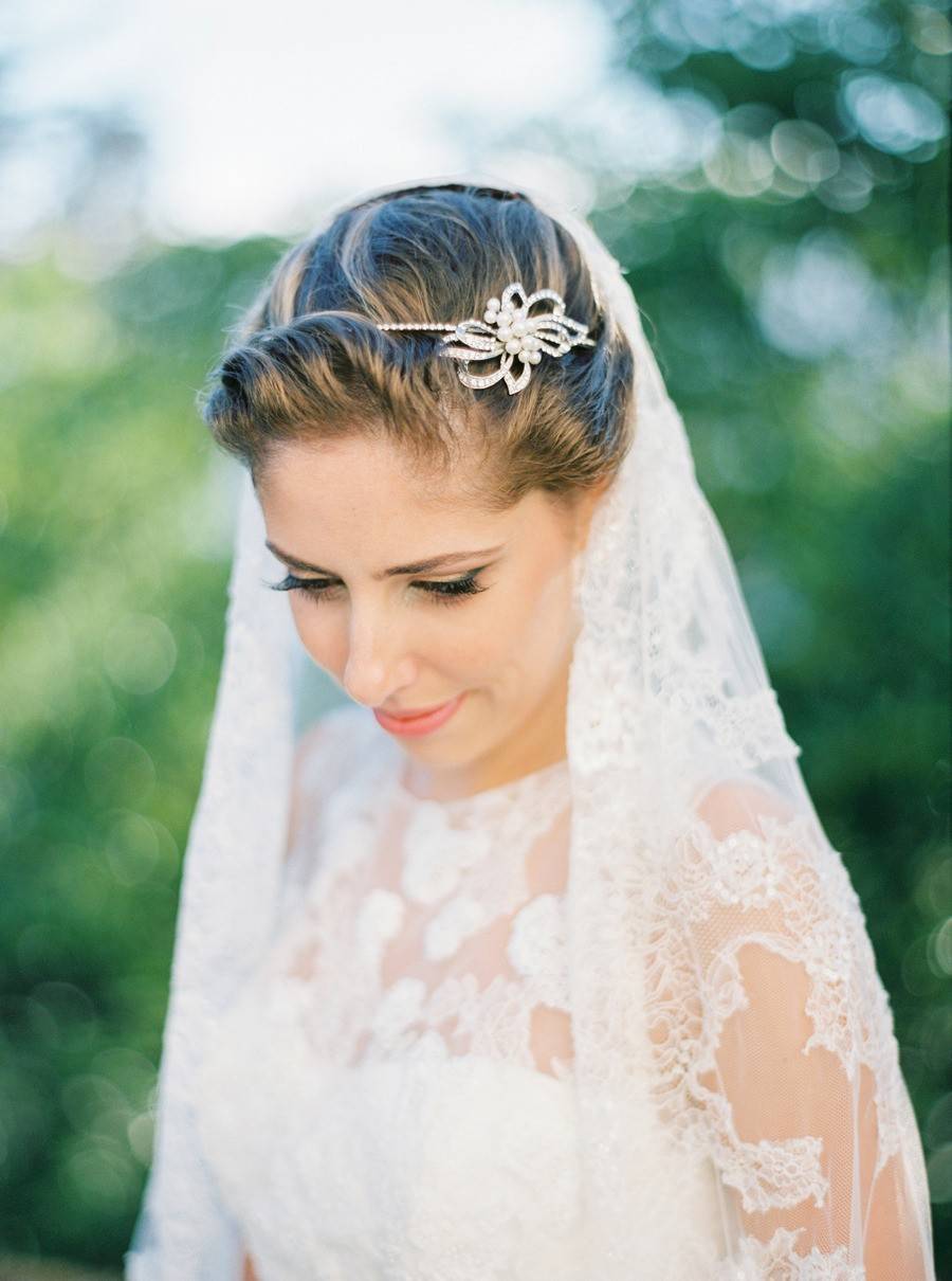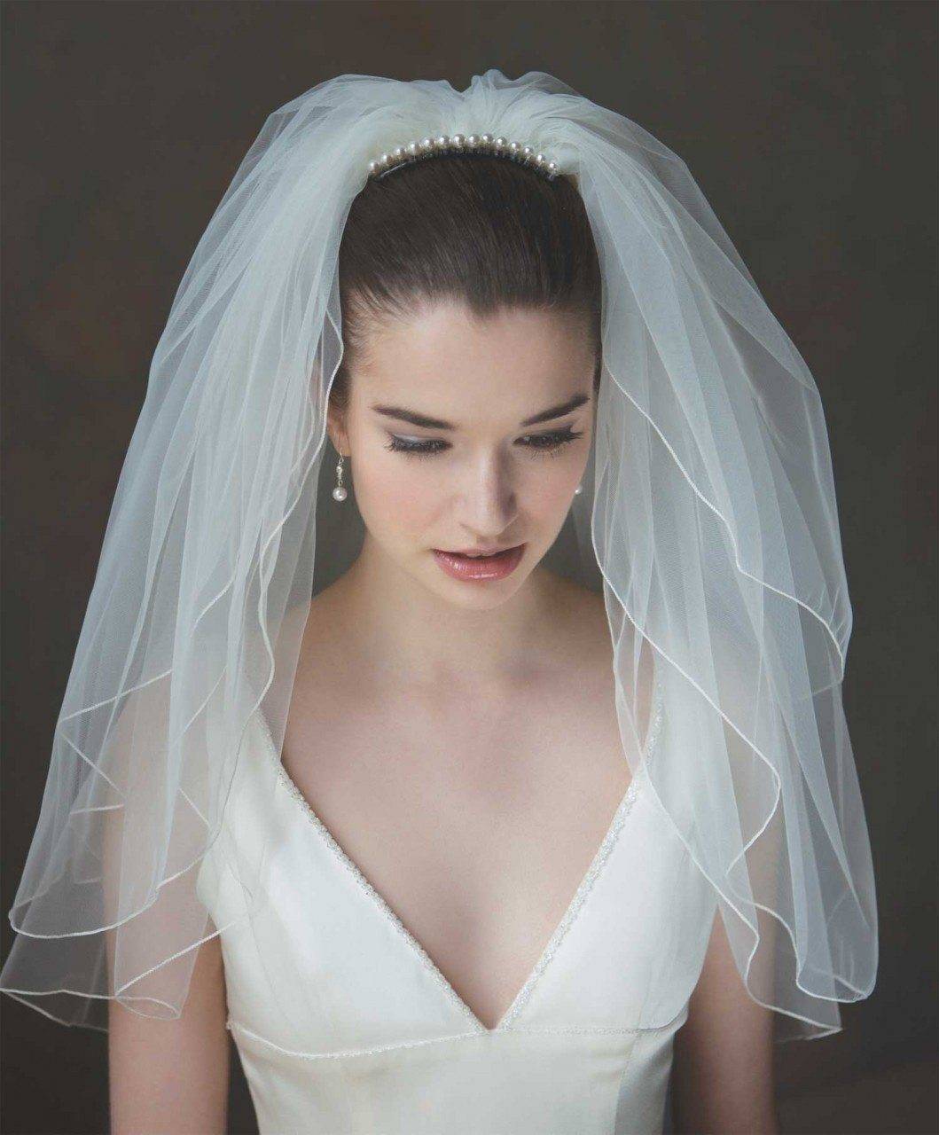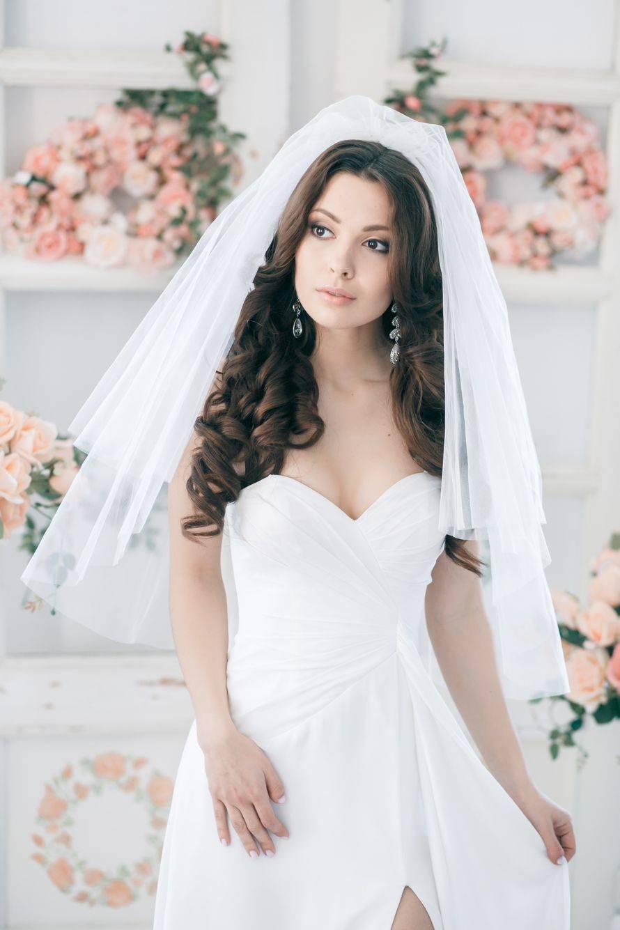 Особенность такой прически заключается в том, что вуаль не закрывает лицо невесты полностью, лишь слегка прикрывая лоб и брови. Вуалетку, придав ей нужную форму, можно прикрепить непосредственно к локонам из завитых волос. Для этого понадобятся зажимы-невидимки.