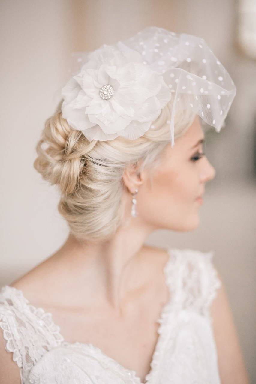 Что касается аксессуаров, то изюминкой укладки станут цветы, банты, гребни или заколки, шляпка с вуалеткой или укороченная фата – именно на такой длине она смотрится наилучшим образом.