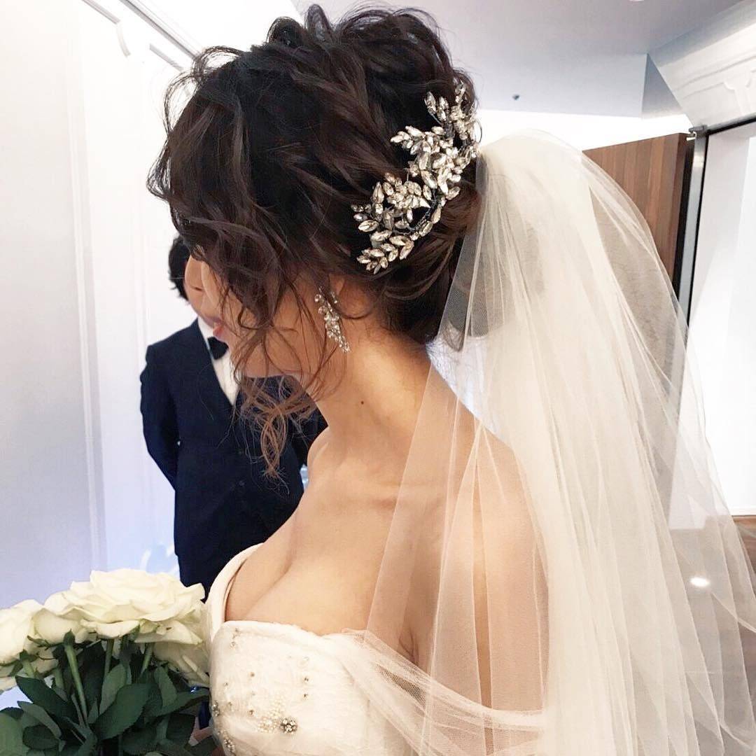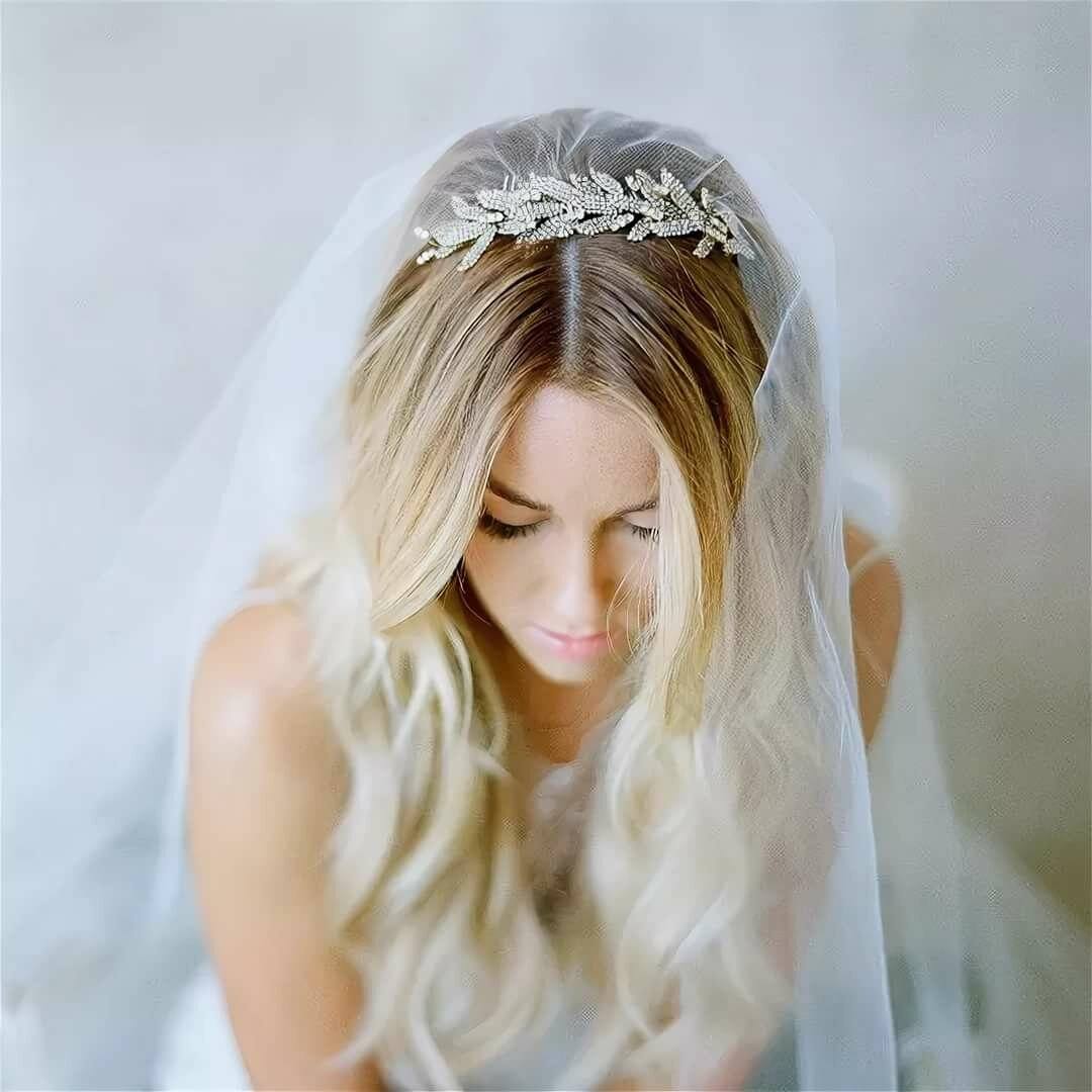 Очень интересный вариант диадем. Его можно крепить обычным способом – сверху головы либо аккуратно опускать до самого низа локонов. Такое украшение выглядит шикарно и больше подходит невестам с длинными и густыми волосами.