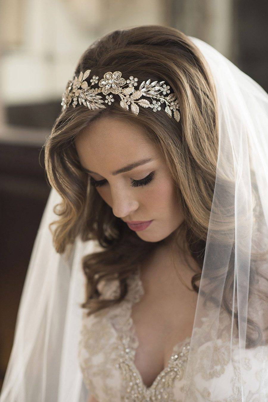 Свадебный образ можно разнообразить, дополнив прическу, таким модным аксессуаром для волос, как металлическая нить. Она может быть со звездами, цветами, бусинами, цепочками.