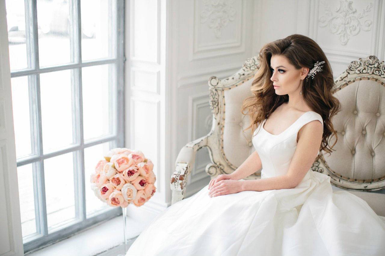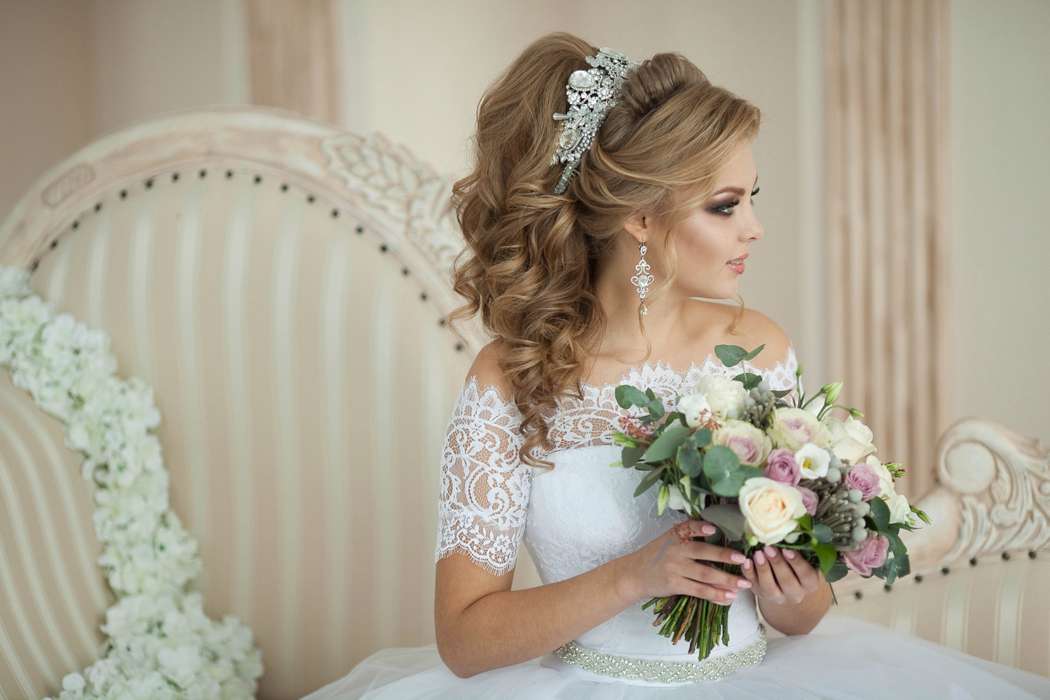 Если фасон свадебного платья сложный или выбраны яркие декоративные элементы, то укладка должна быть максимально простой.