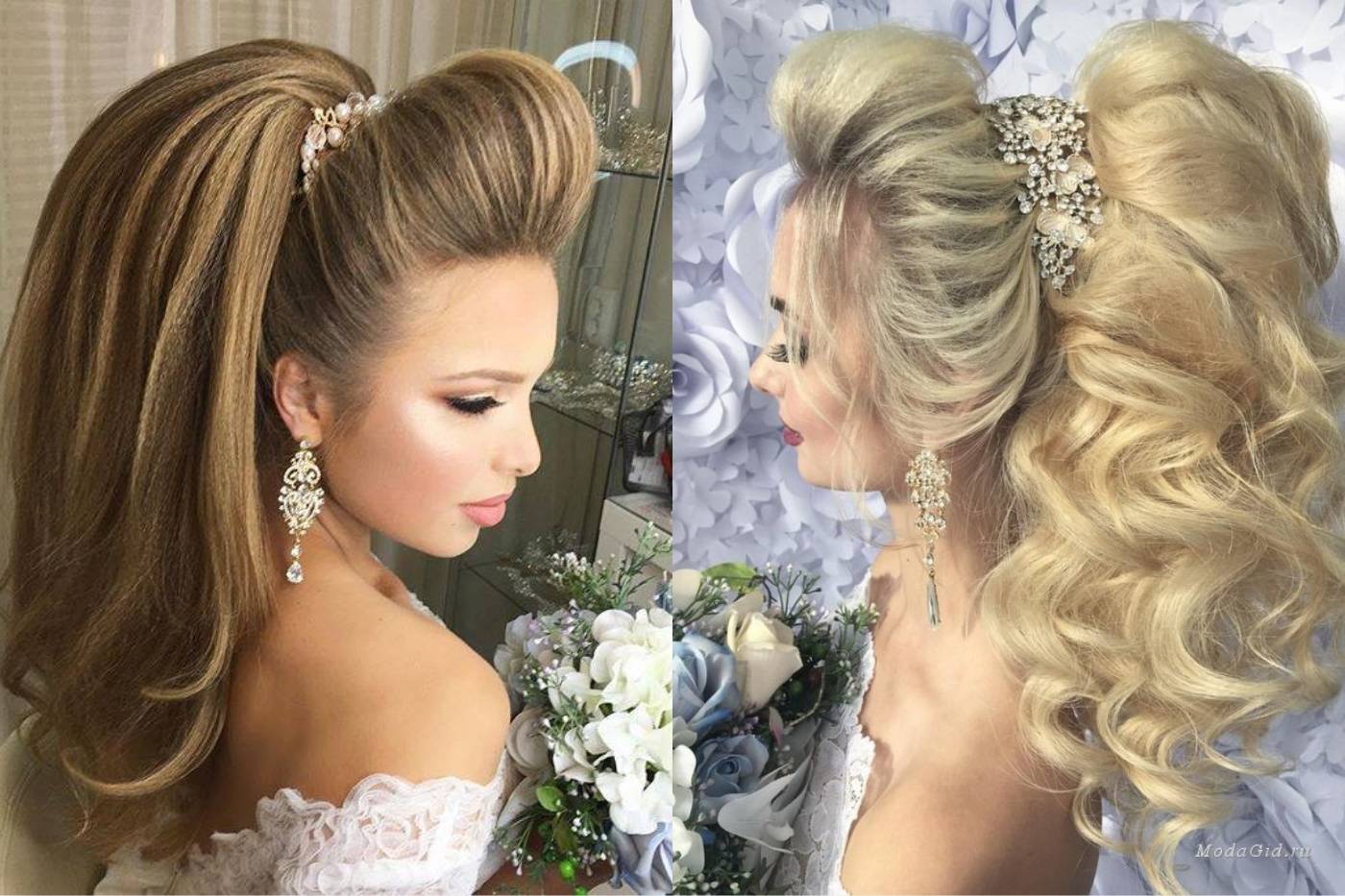 Несмотря на то, что кажется, что прическа с хвостом слишком проста, многие невесты ее делают. Тем более под фату отлично подходит пышный хвост с начесом. Сегодня даже такая прическа может выглядеть празднично и женственно.