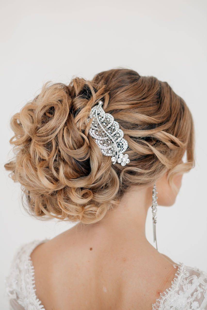 Прическа пучок на свадьбу, если она собрана высоко, подходит девушкам с длинными волосами. Их предварительно можно накрутить, так как локоны, собранные в высокий пучок на свадьбу выглядят потрясающе. Такой вариант украшают короной, диадемой, тиарой. Не будет лишней и челка.