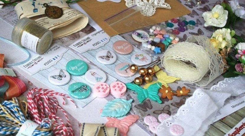 - Металлические уголки для декора, бумага для скрапбукинга, ленты, цветы, чипборды, вырубки, кружева.
