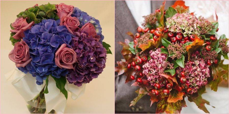 Гортензия. Букет невесты из ранункулюсов также можно дополнить очень нежным и красивым цветком гортензии. Такое сочетание будет очень стильным и оригинальным, благодаря контрасту крупных и мелких цветков. Также гортензию часто используют флористы, когда им необходимо добавить букету ярких необычных красок, таких как фиолетовый, голубой или синий.