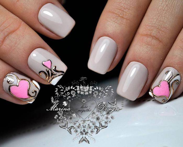 Дизайн с сердцами очень хорошо будет смотреться на ногтях закругленной формы. Сердечки станут неким акцентом и подчеркнут ваше влюбленное настроение. Сердце можно нарисовать кистью, оставить негативное пространство на ногтях, отпечатать фольгой, выложить из страз или бульонок.