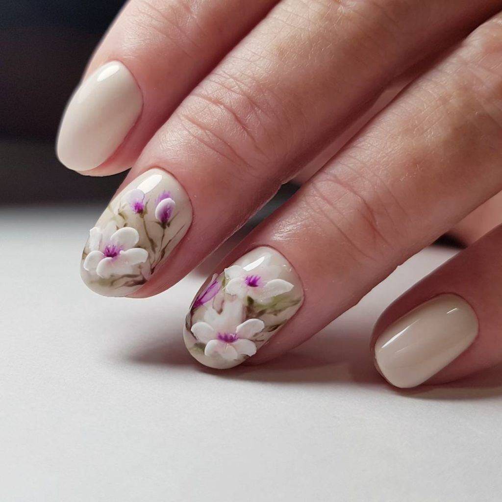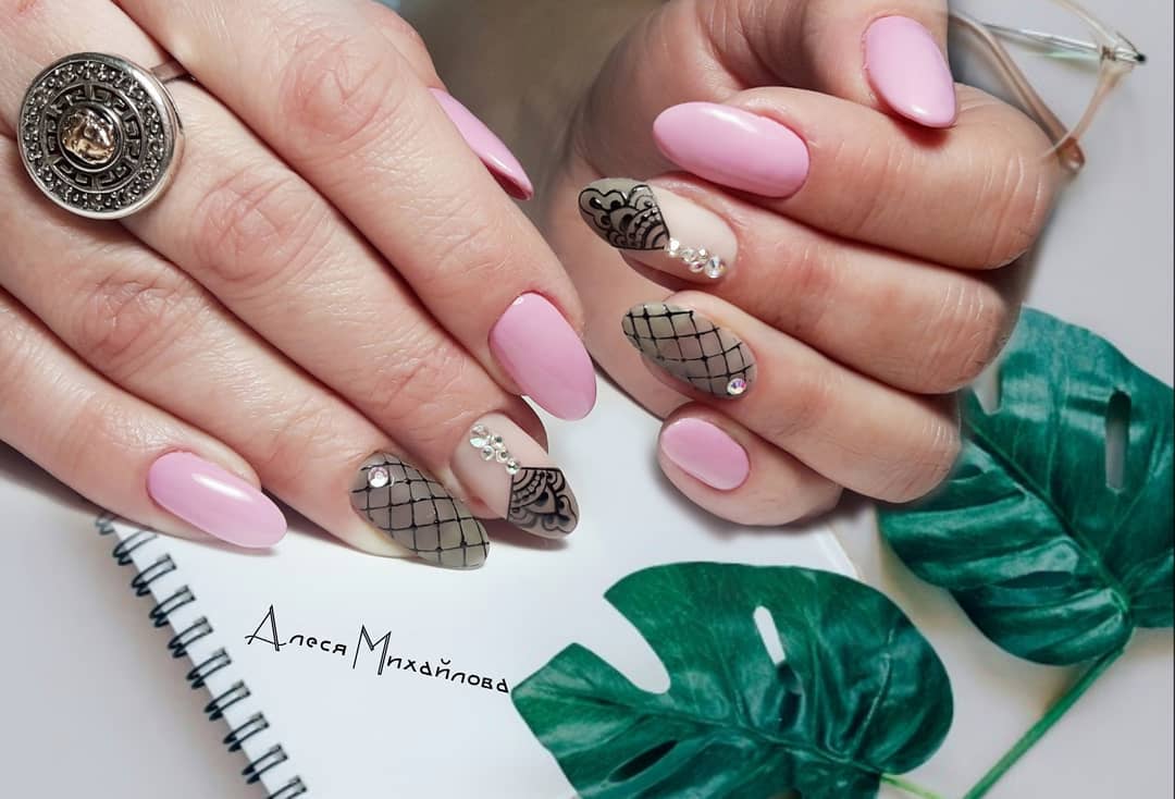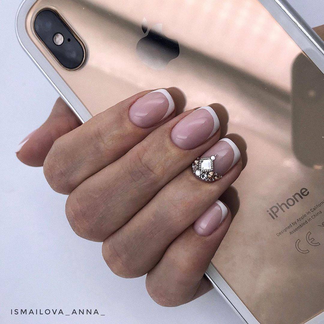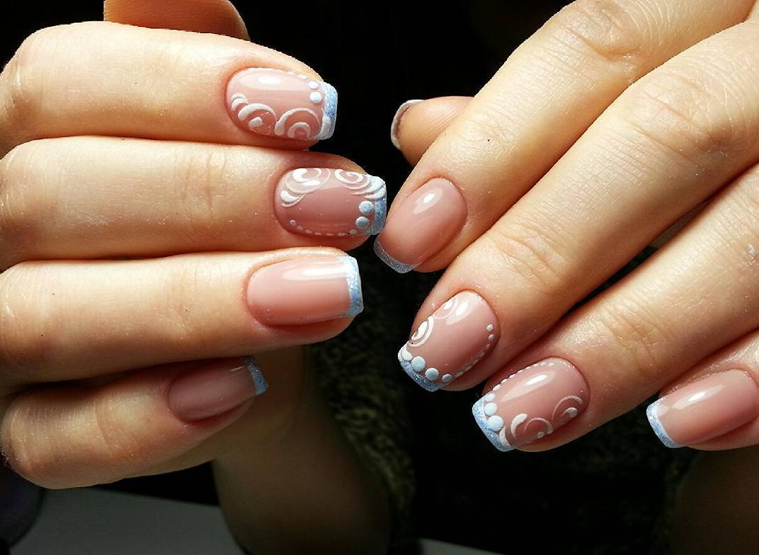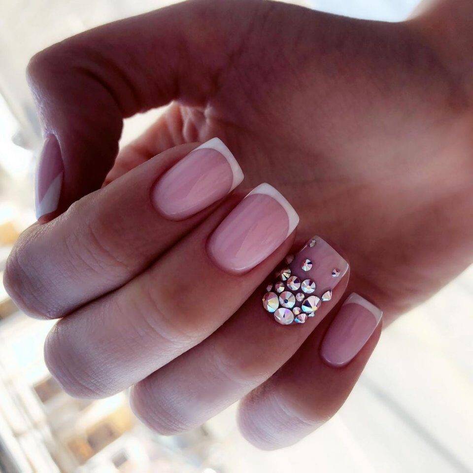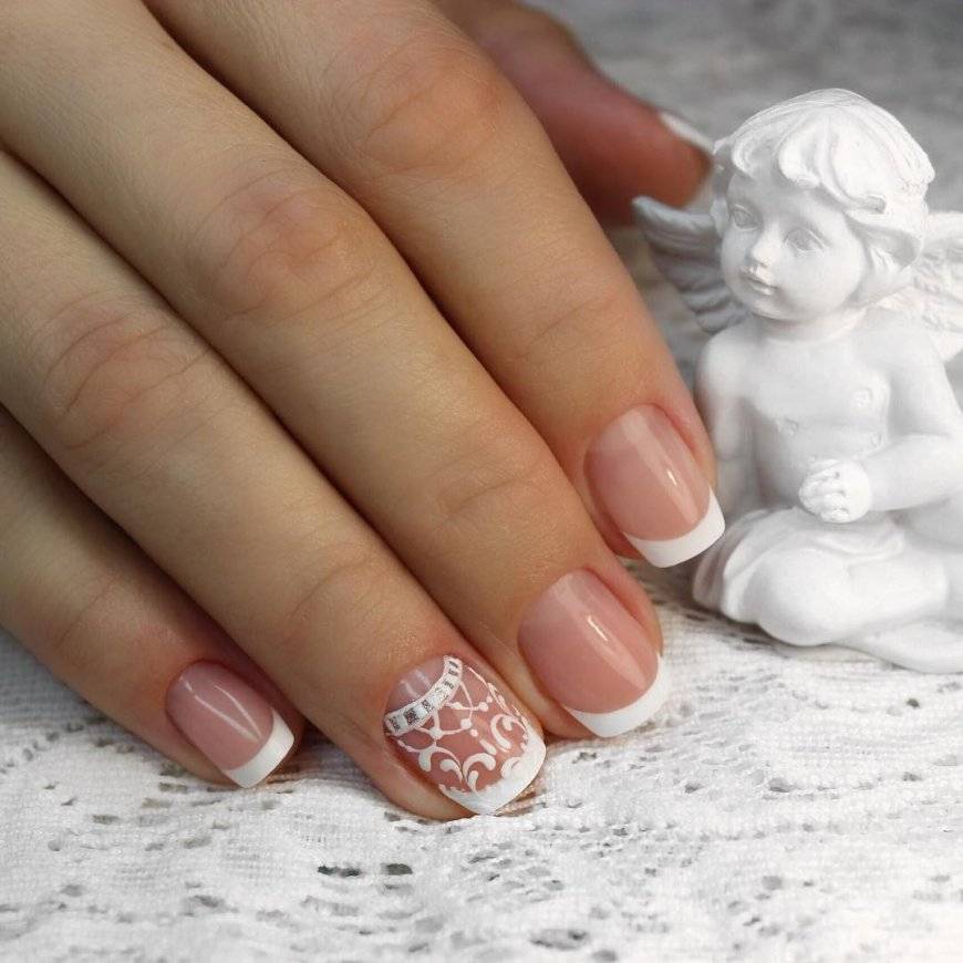 Обычно он дополняется кружевными узорами, флористическими мотивами, художественной росписью, стразами. Такой вариант всегда популярен, так как отличается скромностью и изяществом. Такой маникюр идеально подходит для длинных и средних ногтей. Классические оттенки – полупрозрачный розовый, бежевый, молочный, нюдовый.