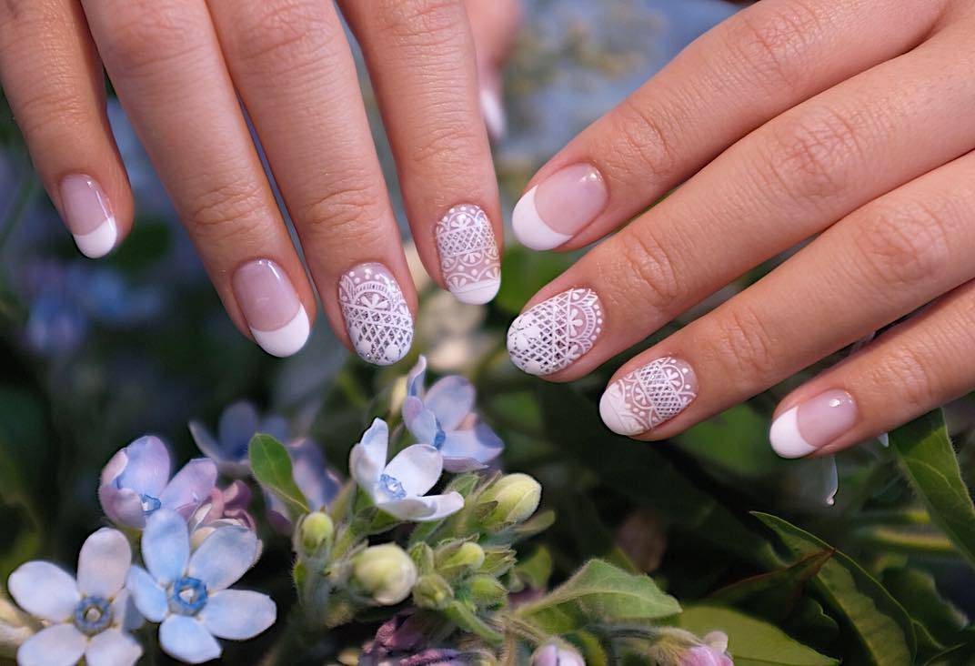 Кружево – это одна из самых нежных и красивых тканей для свадебного платья. Продолжение темы кружева на ногтях невесты может стать прекрасным дополнением к волнительному и романтичному образу. Кружевной узор в свадебном французском маникюре может быть прорисован как от руки, так и с помощью стемпинга: оба варианта замечательно смотрятся как в реальности, так и на фото.