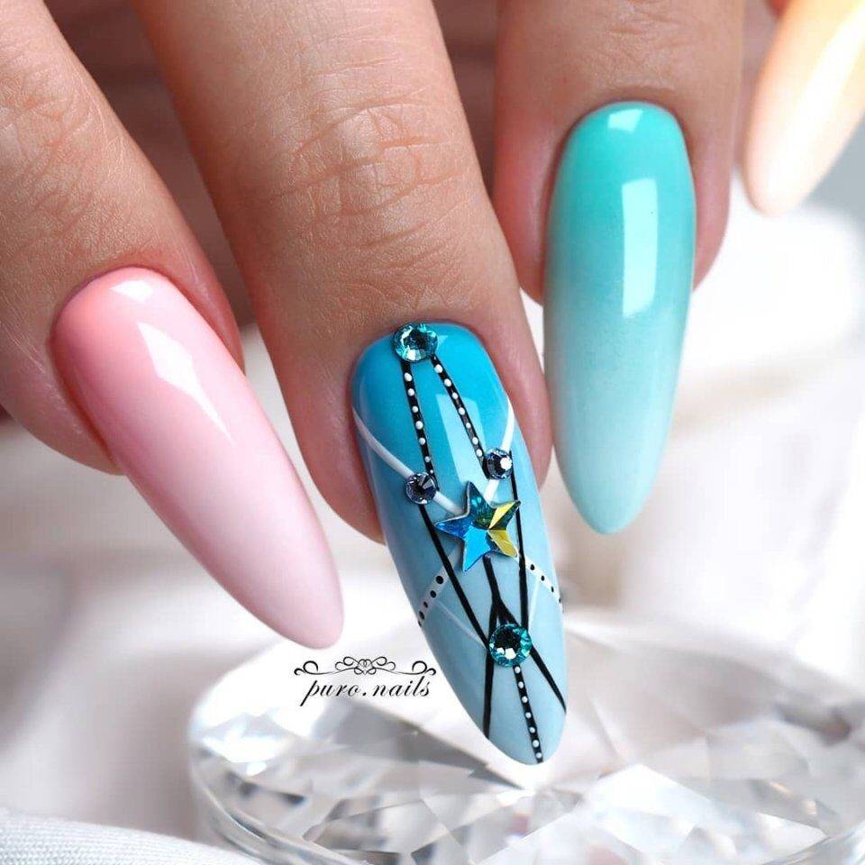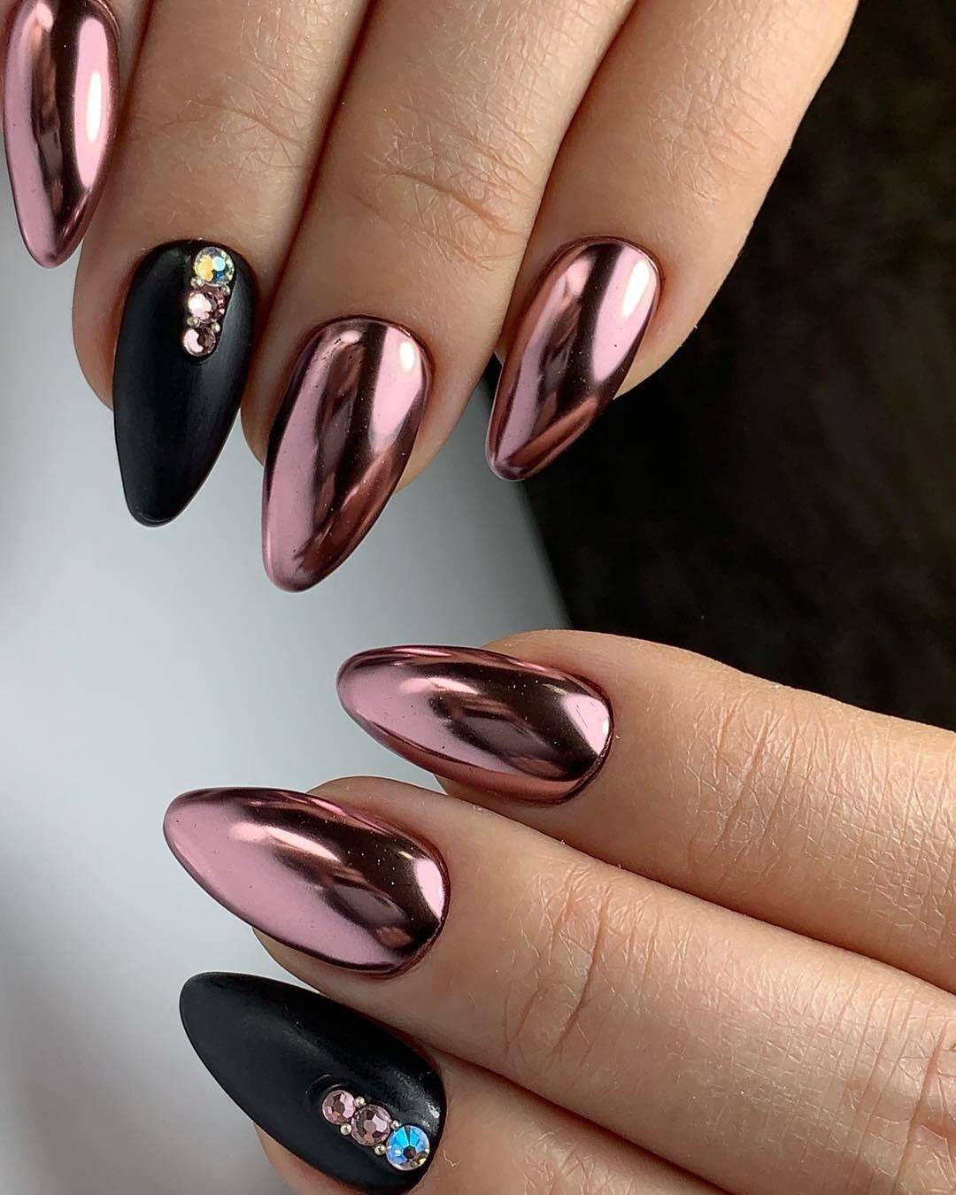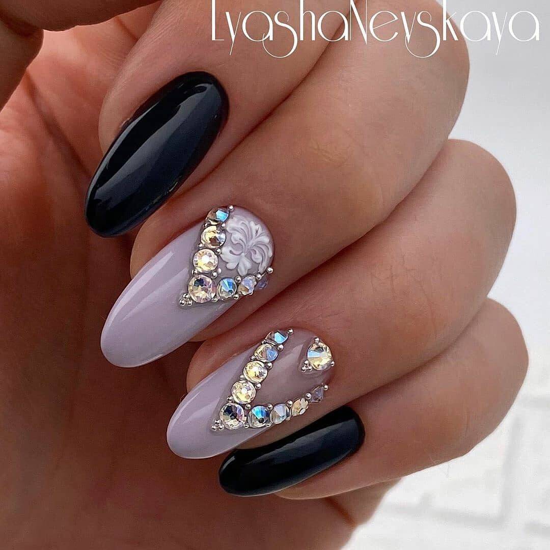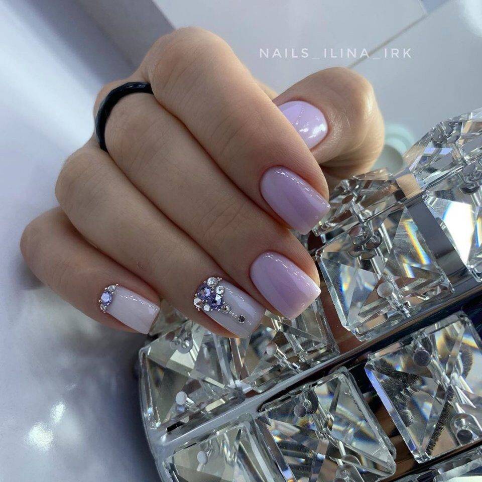 Специалисты рекомендуют выбирать стразы разного размера, и акцентировать внимание 1-2 ногтях. Разумно украсить безымянные пальчики
