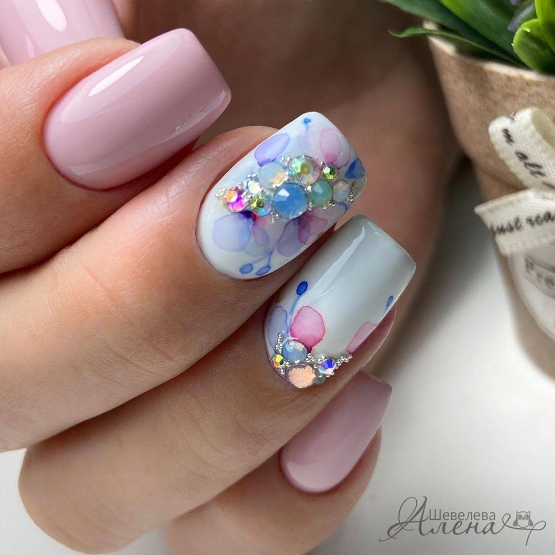 - жидкие кристаллы – камни, имеющие гелевую консистенцию, застывающую под воздействием LED или УФ-лампы. Жидкие камни выглядят шикарно и изысканно, но имеют существенный недостаток – они необычайно мягкие и неустойчивые к внешним повреждениям. Жидкие камни чаще всего используют для создания торжественных нейл-артов на 1-2 дня, но в повседневных образах они непрактичны.