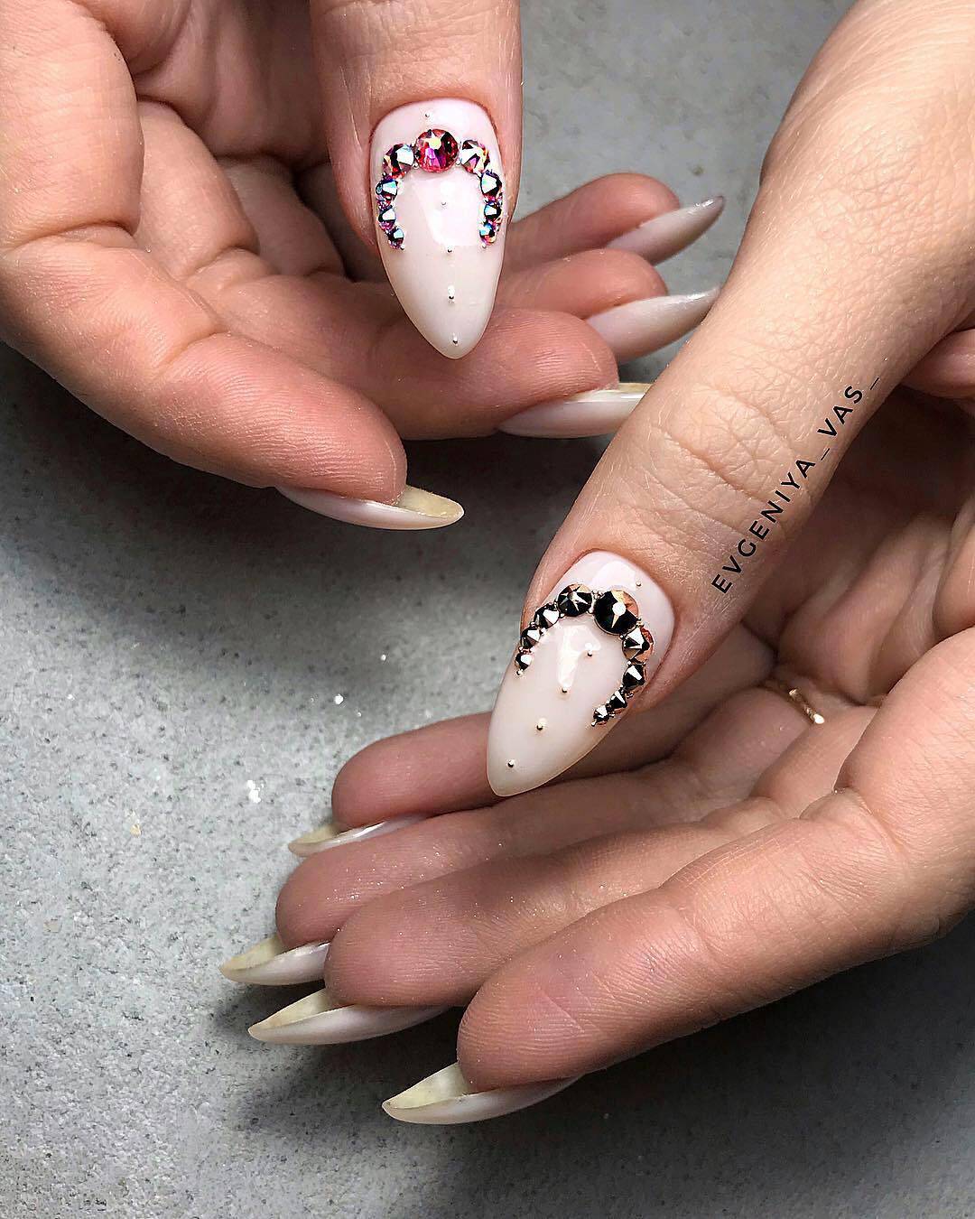 - кристаллы Сваровски – легендарные камни, которые представлены в разных цветовых решениях. Кристаллы Сваровски отличаются от обычных стразов непередаваемым сиянием и свечением, которое безумно красиво смотрится на ногтях невест. Инкрустация из стразов Сваровски удивительно красиво выглядит на миндальных и квадратных ногтях.