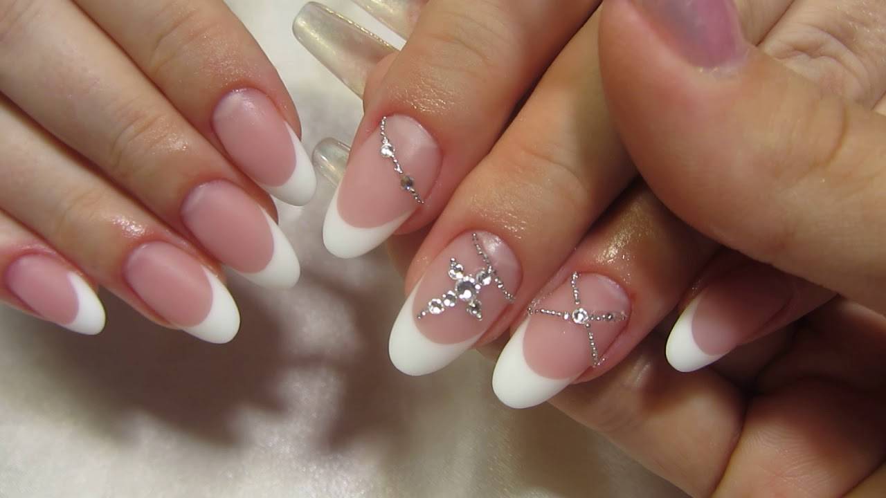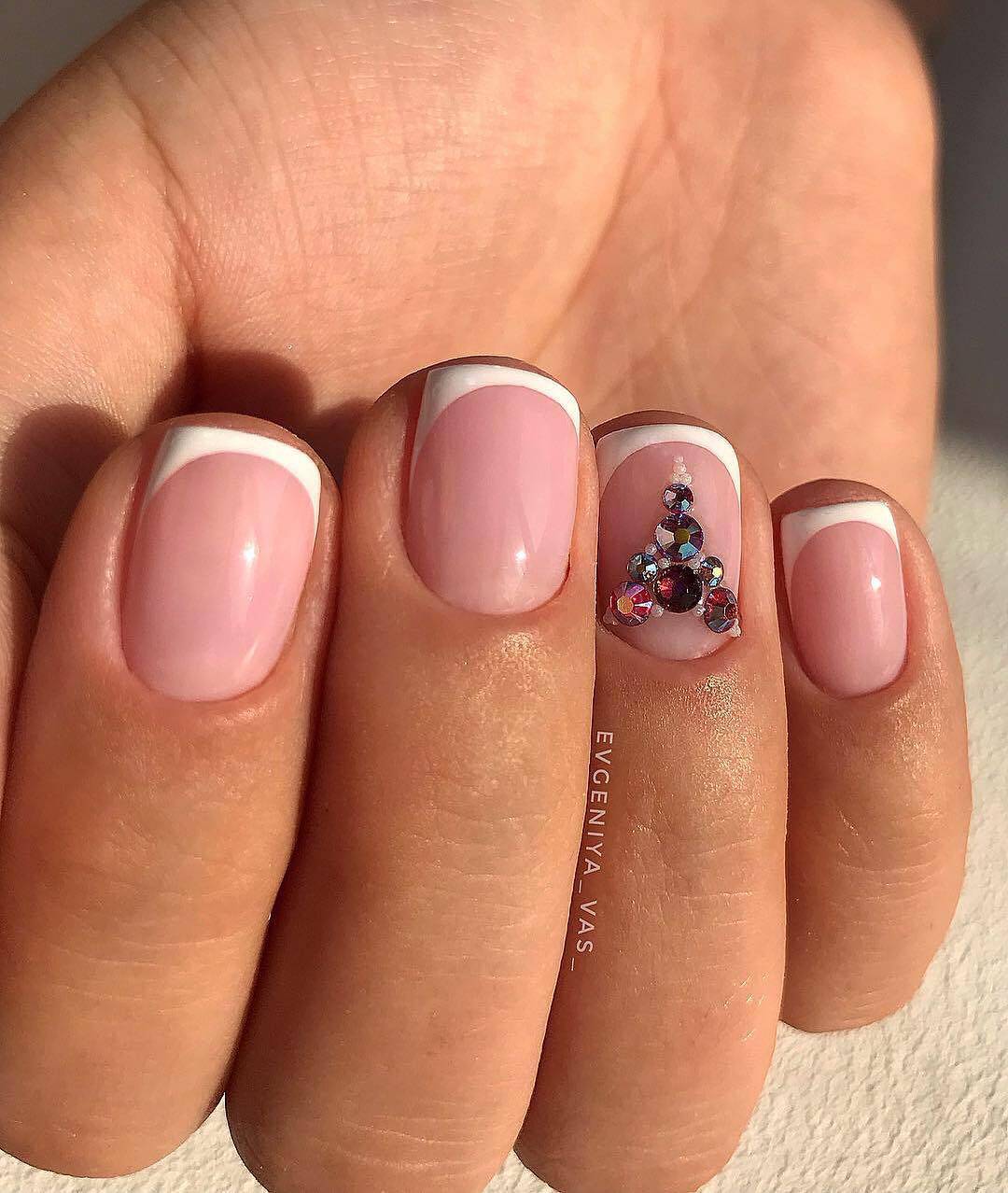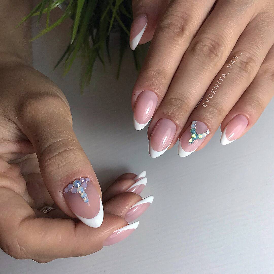 Белый френч с рисунками смотрится хорошо на округлых и удлинённых ногтях. Для него подходят стразы холодных тонов: белые, серебристые, розовые, голубые и малиновые.
