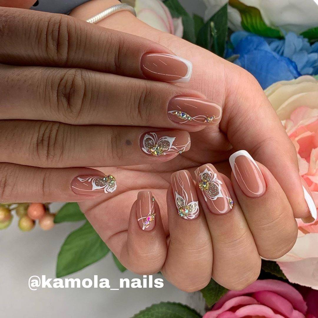 Французский маникюр со стразами и рисунком в виде снежинок, цветов и бабочек смотрится празднично и романтично. Он хорошо сочетается с белой одеждой, джинсовым стилем, может подойти в качестве свадебного варианта.