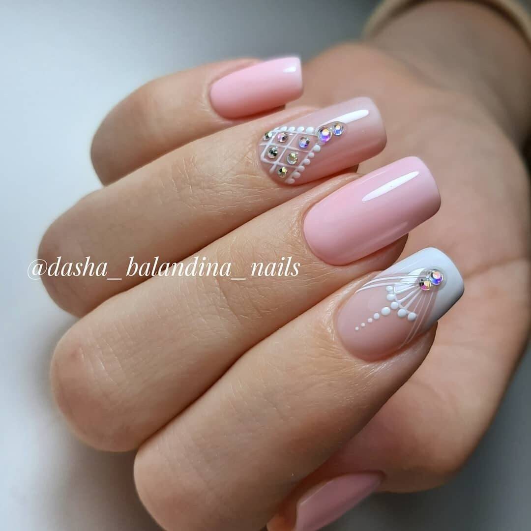 Красиво смотрится бело-розовый дизайн на квадратной форме с укороченной длиной, особенно без декора. Простая стилистика оформления подходит для повседневного ношения и в праздничный период, поскольку не требуется дополнительного ухода. Каждая форма вносит изюминку во внешний вид пальчиков.