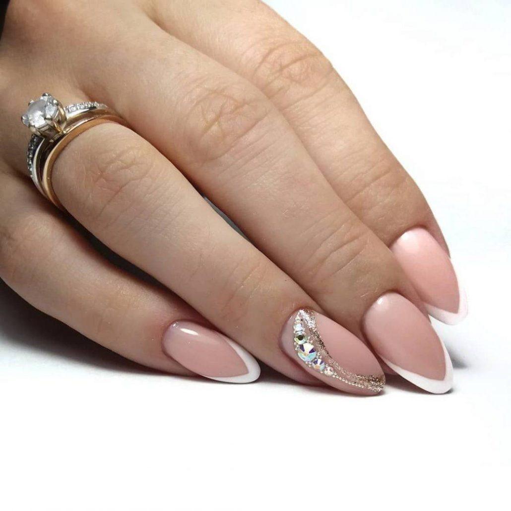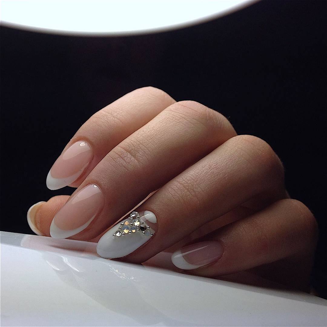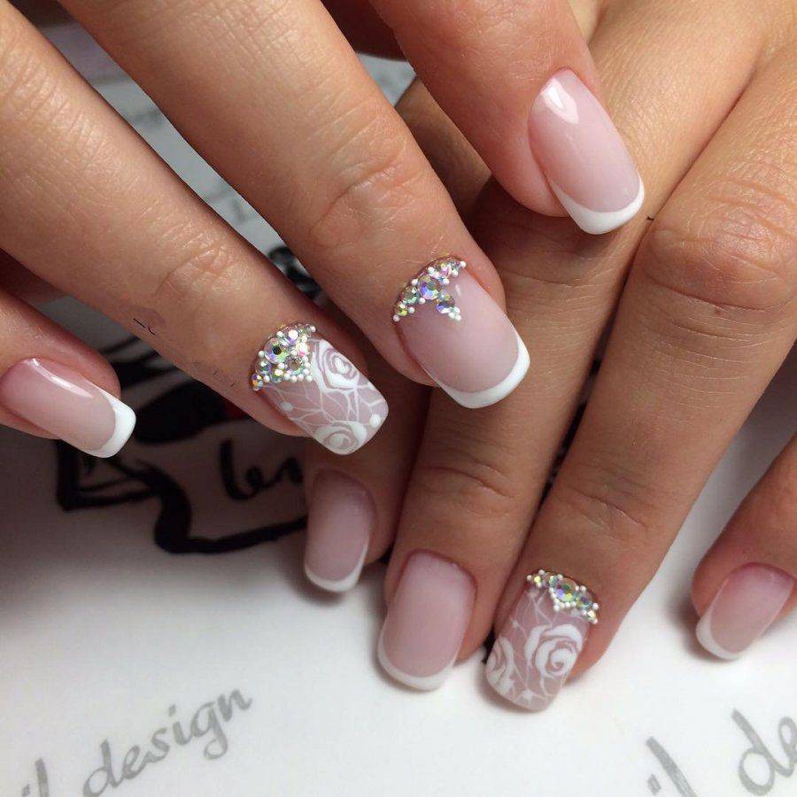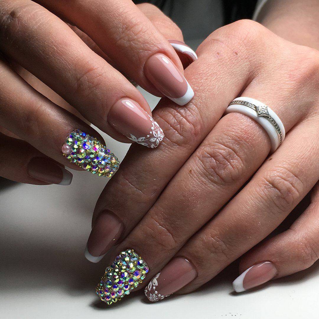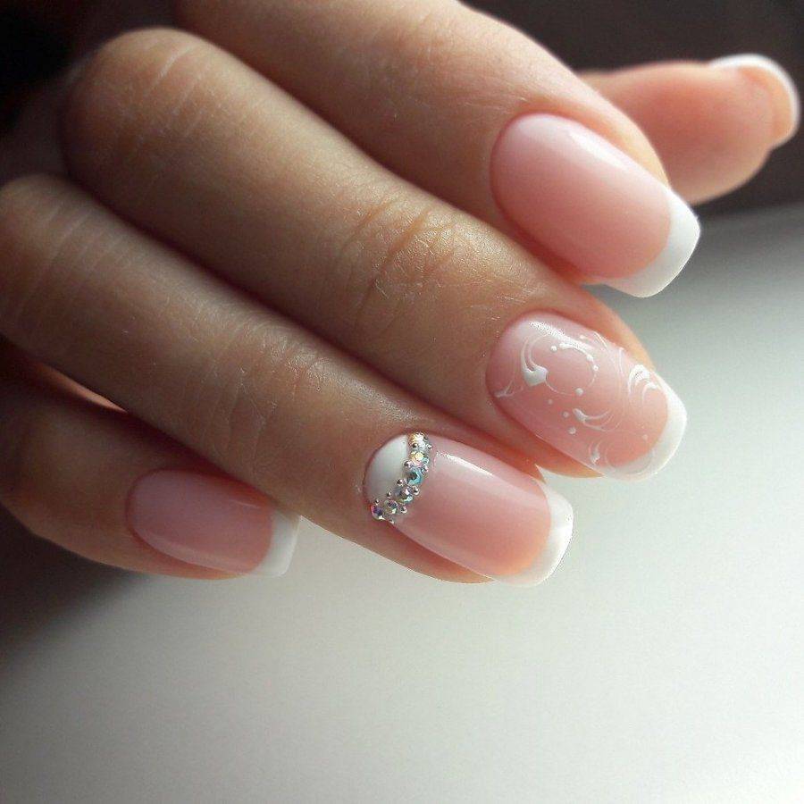 Также камень можно вписать в орнамент на ногте. Очень популярной стала идея украшать стразами безымянный палец и таким образом выделять его. Подобный свадебный маникюр френч со стразами (фото ниже) смотрится изысканно и величественно.
