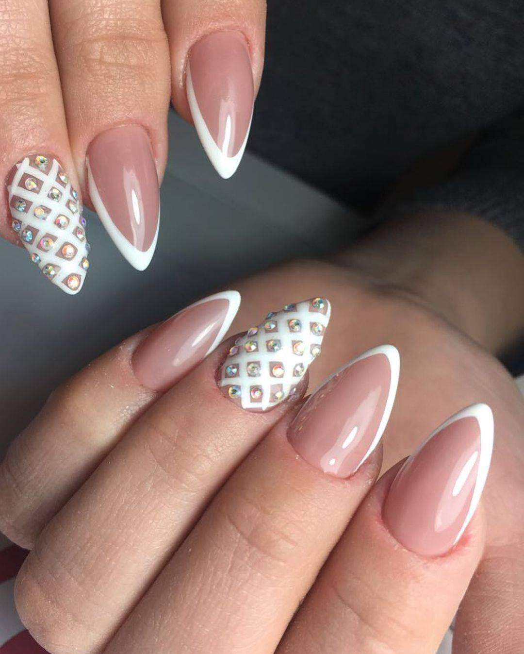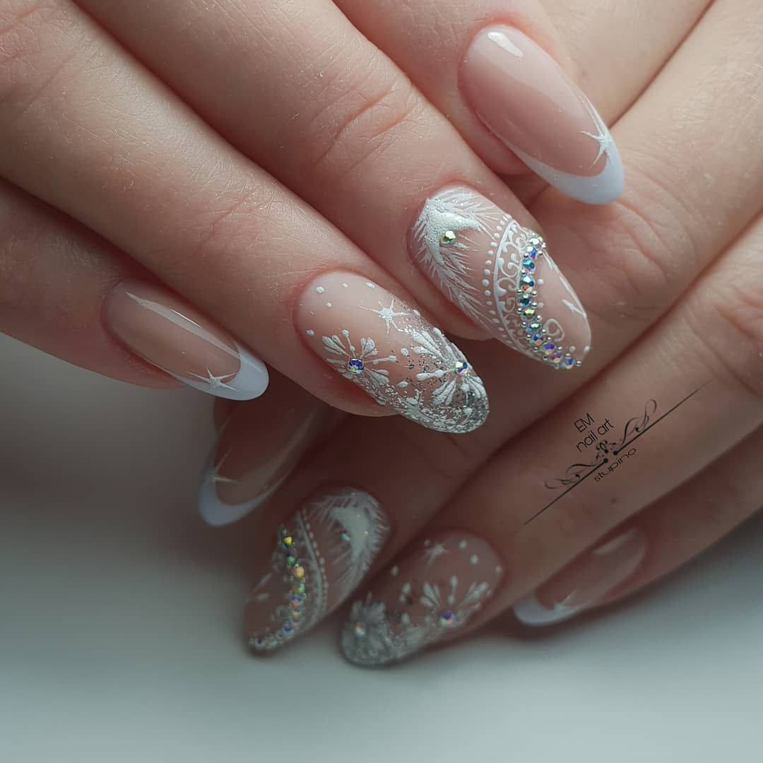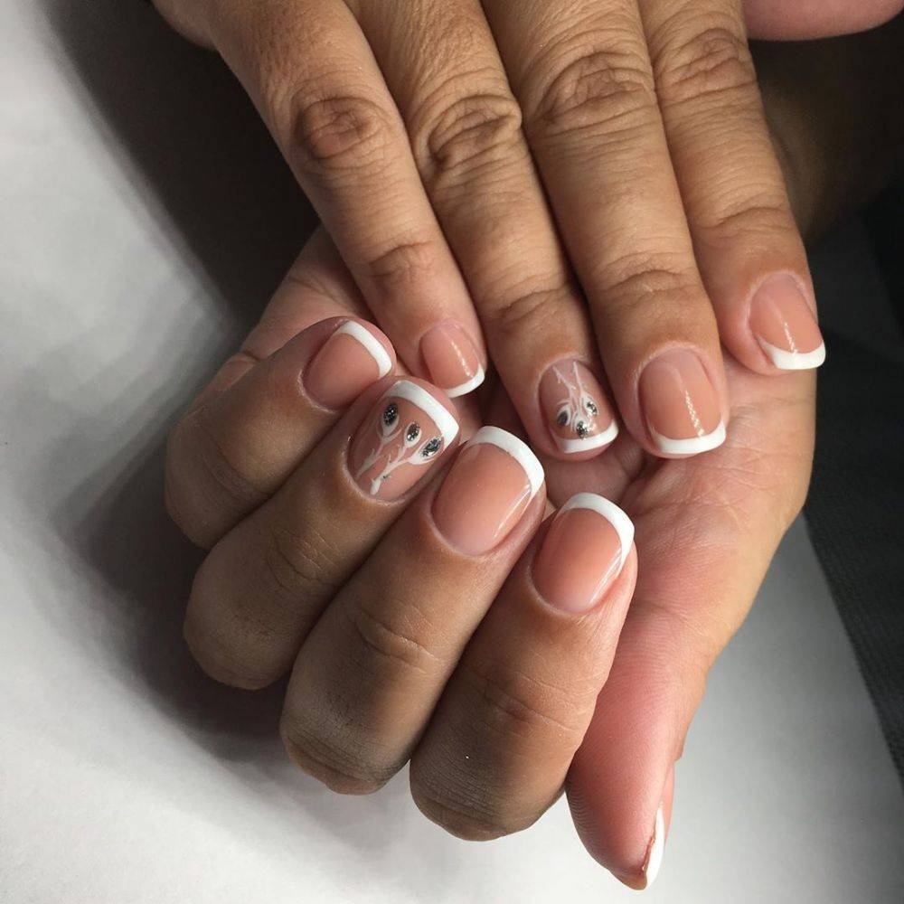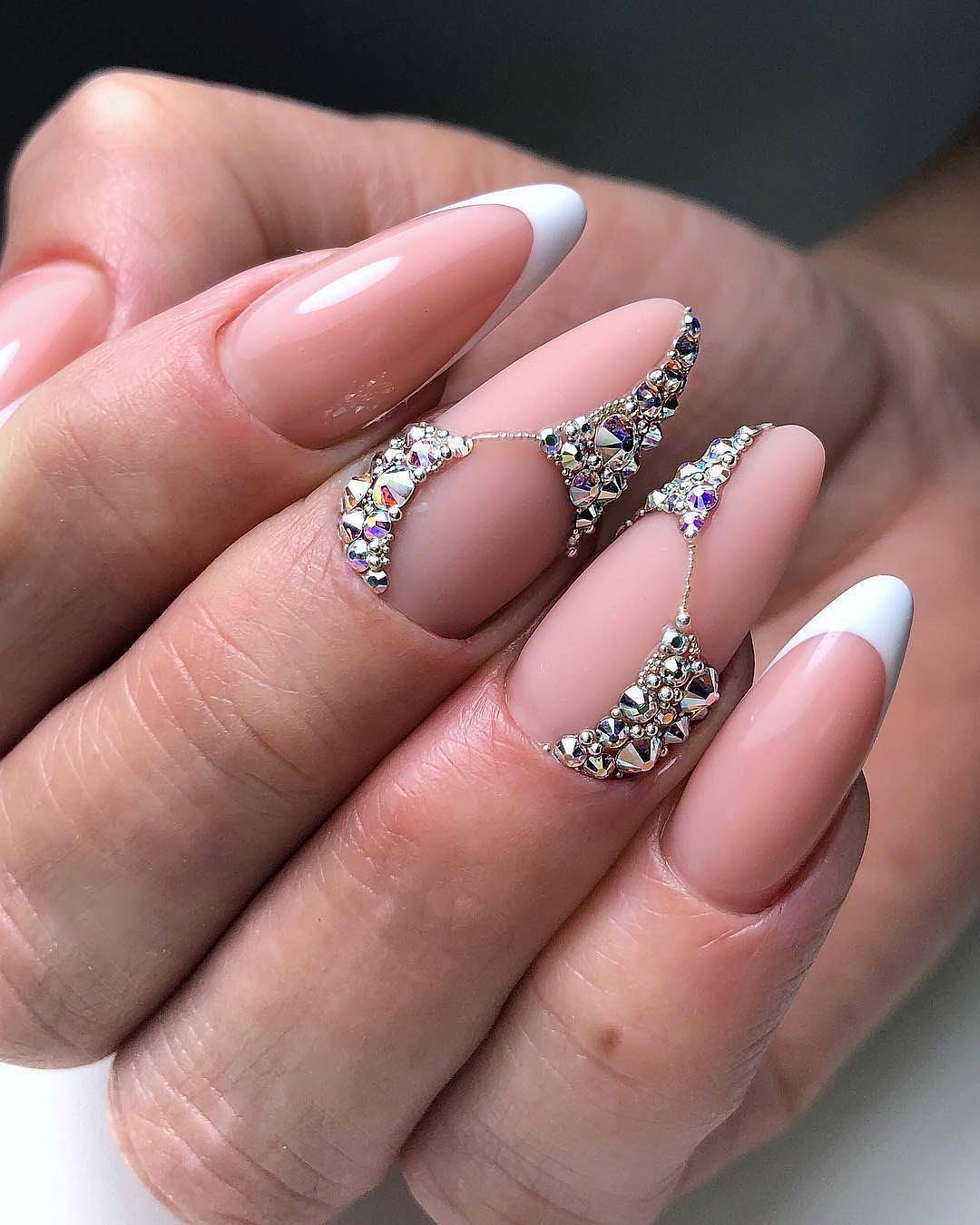 Также камень можно вписать в орнамент на ногте. Очень популярной стала идея украшать стразами безымянный палец и таким образом выделять его. Подобный свадебный маникюр френч со стразами (фото ниже) смотрится изысканно и величественно.