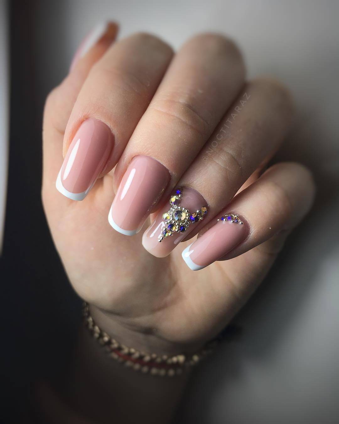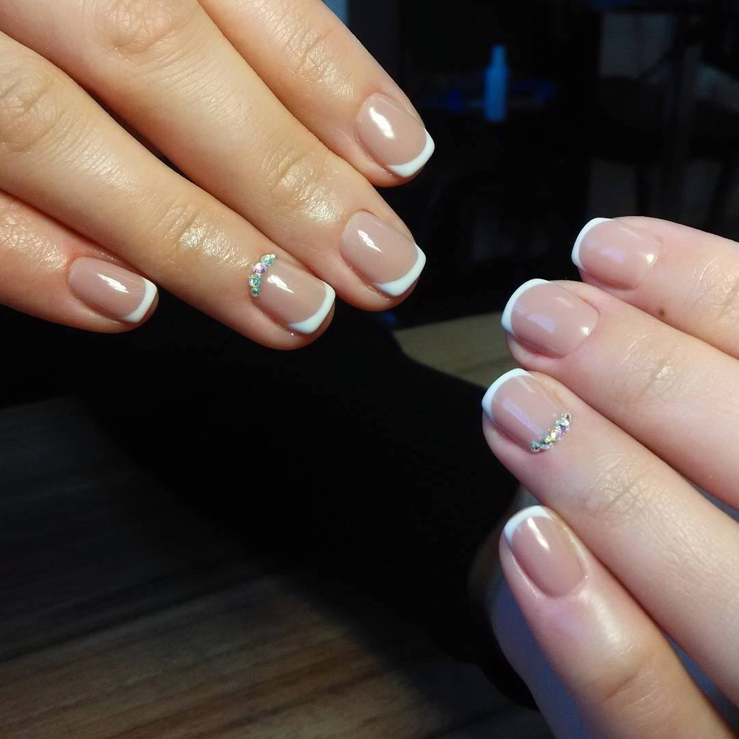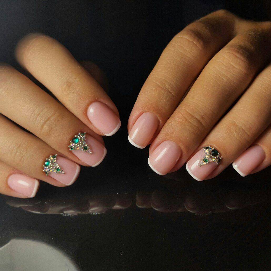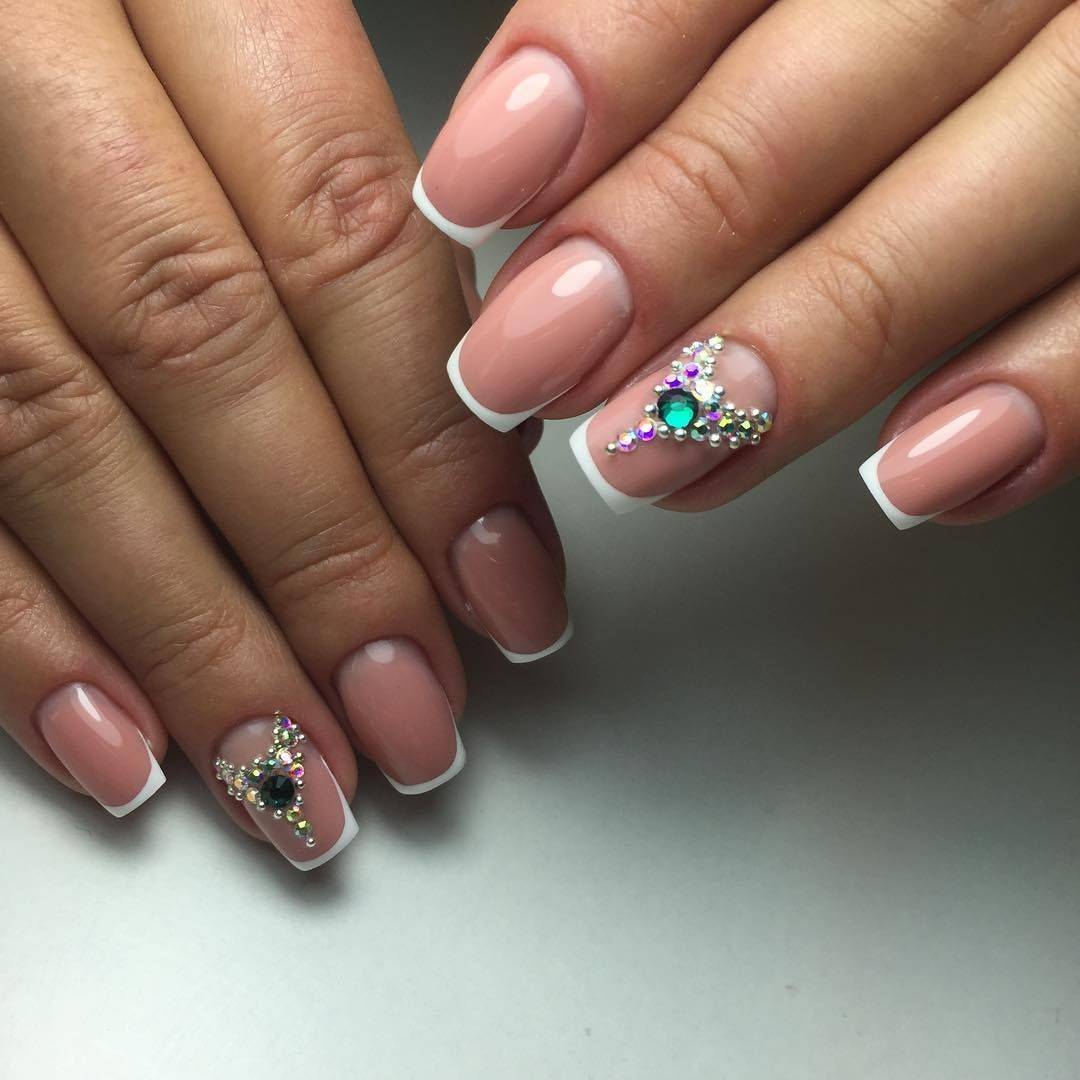Французский маникюр со стразами уже по праву относится к классическому оформлению. Ведь даже в повседневной жизни современные модницы предпочитают использовать немного декора. Это делает маникюр более свежим, ярким и модным.