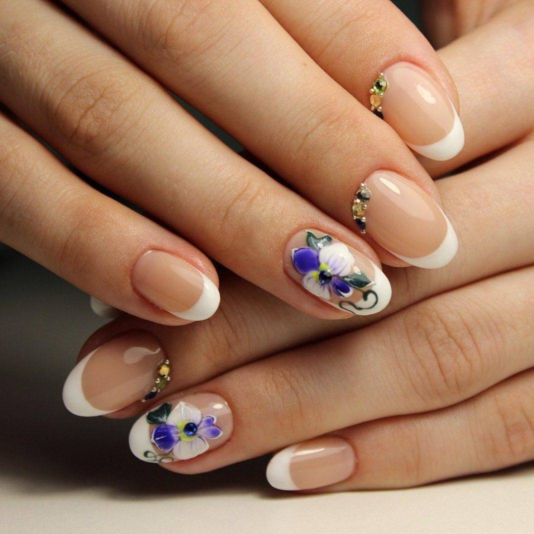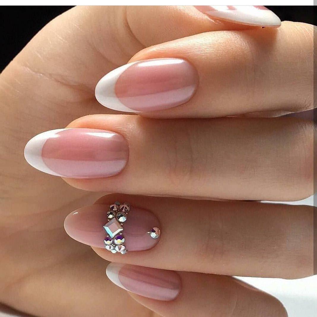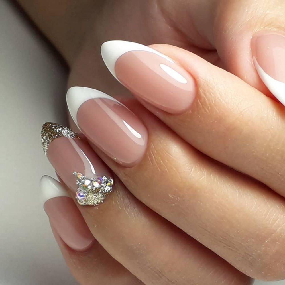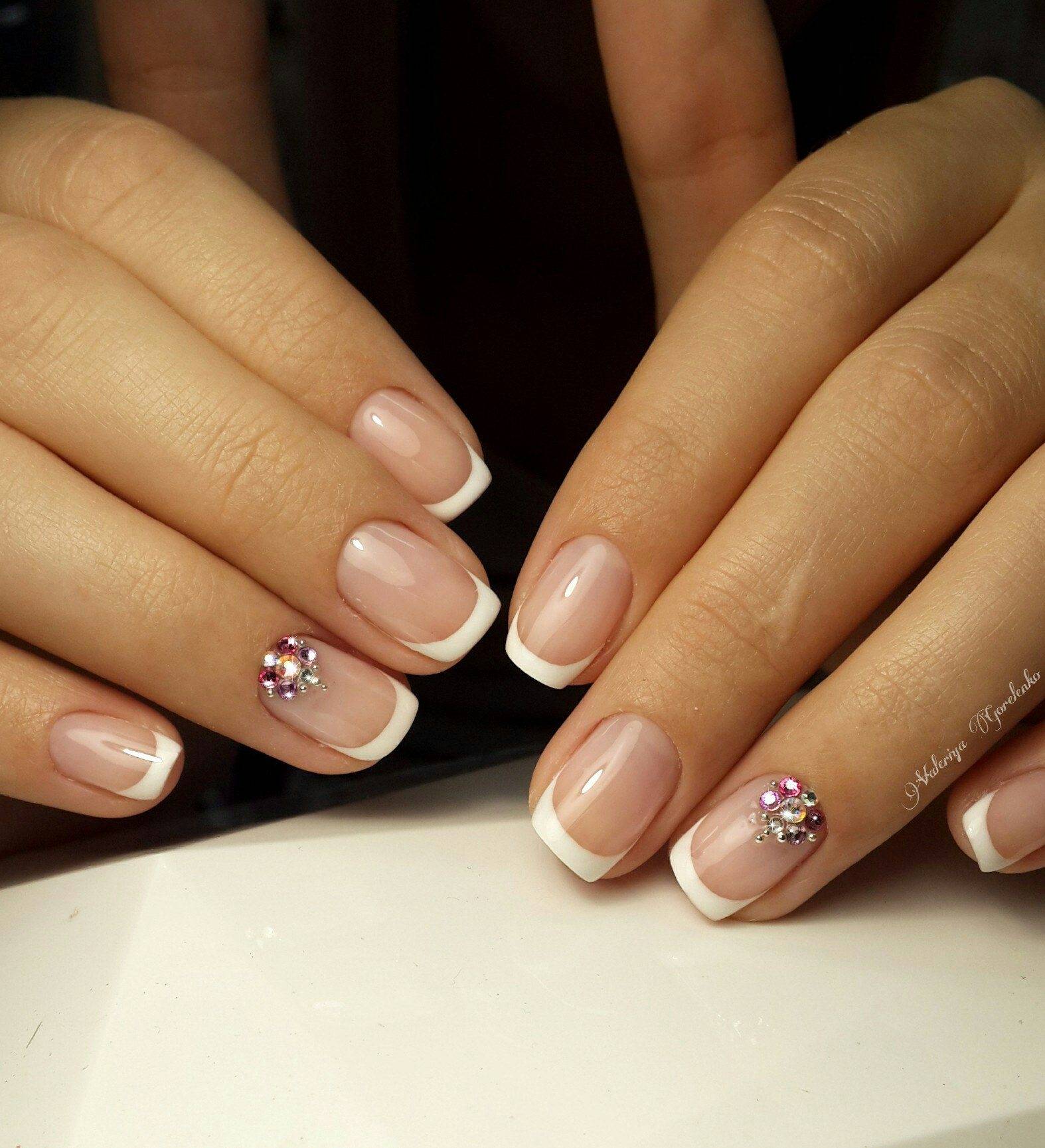 Французский маникюр со стразами уже по праву относится к классическому оформлению. Ведь даже в повседневной жизни современные модницы предпочитают использовать немного декора. Это делает маникюр более свежим, ярким и модным.