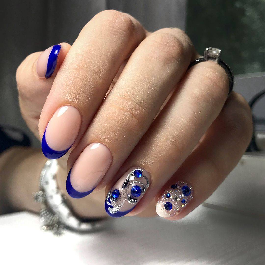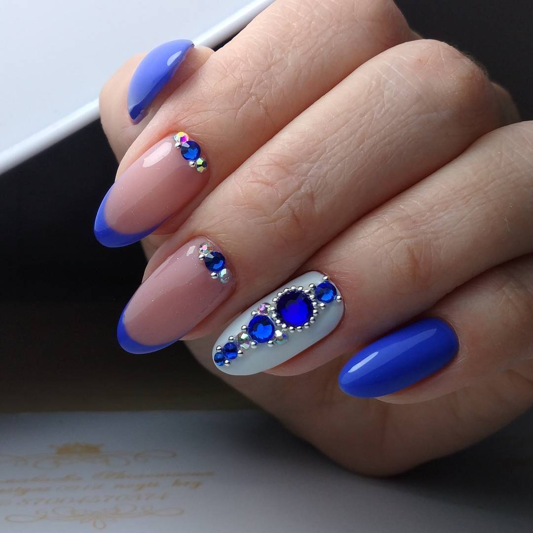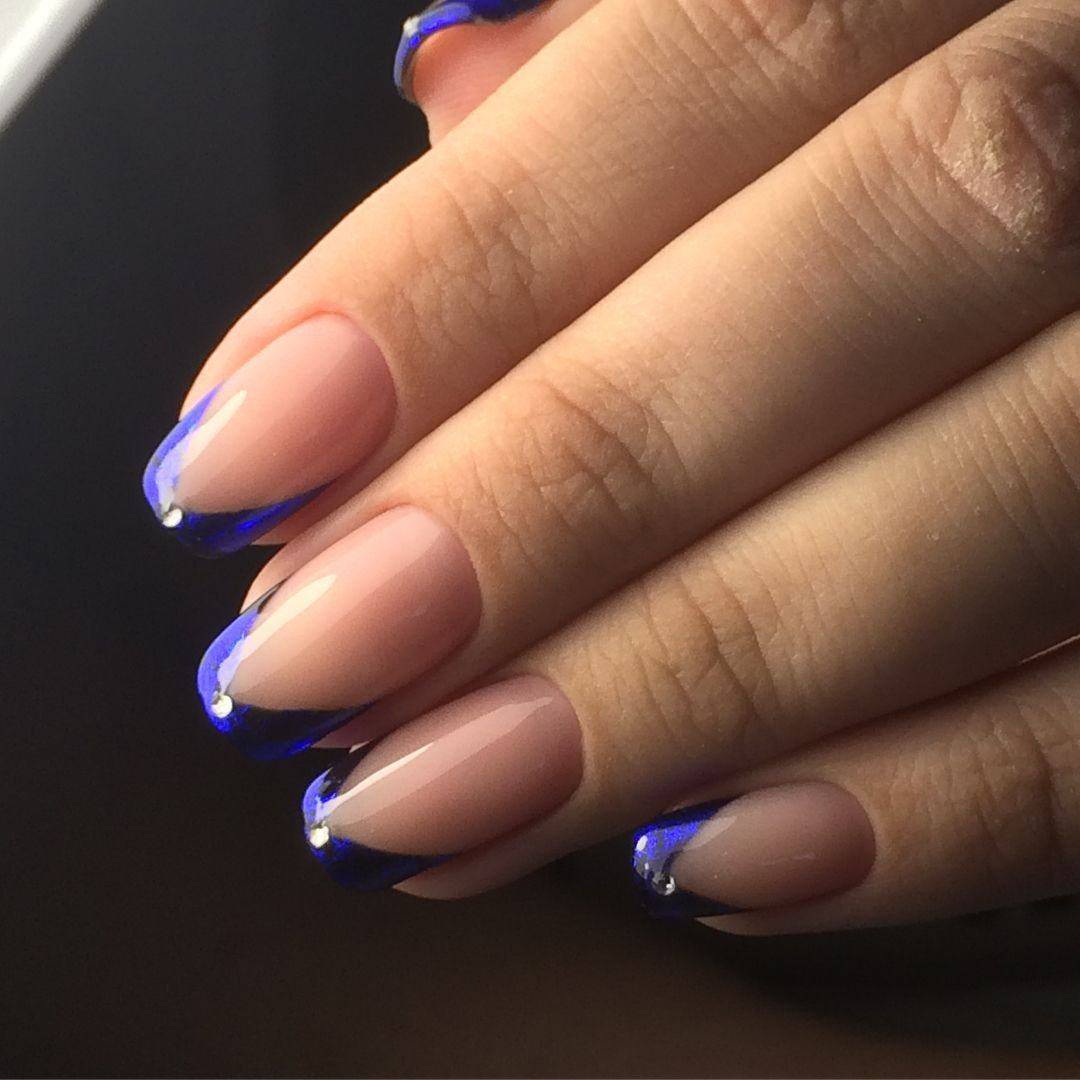 Очень красиво смотрится как классический однотонный синий маникюр, так и сочетание синего с белым цветом.