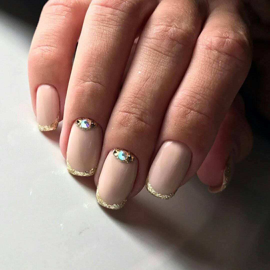 - Стразы. Если ваш наряд расшит камнями или жемчужинами, обязательно используйте для декора ногтей стразы. Не стоит клеить камни на всю поверхность ногтя. Достаточно выложить область лунулы или по линии начала свободного края. Выбирайте качественные камни Сваровски, которые при попадании солнечных лучей красиво переливаются.