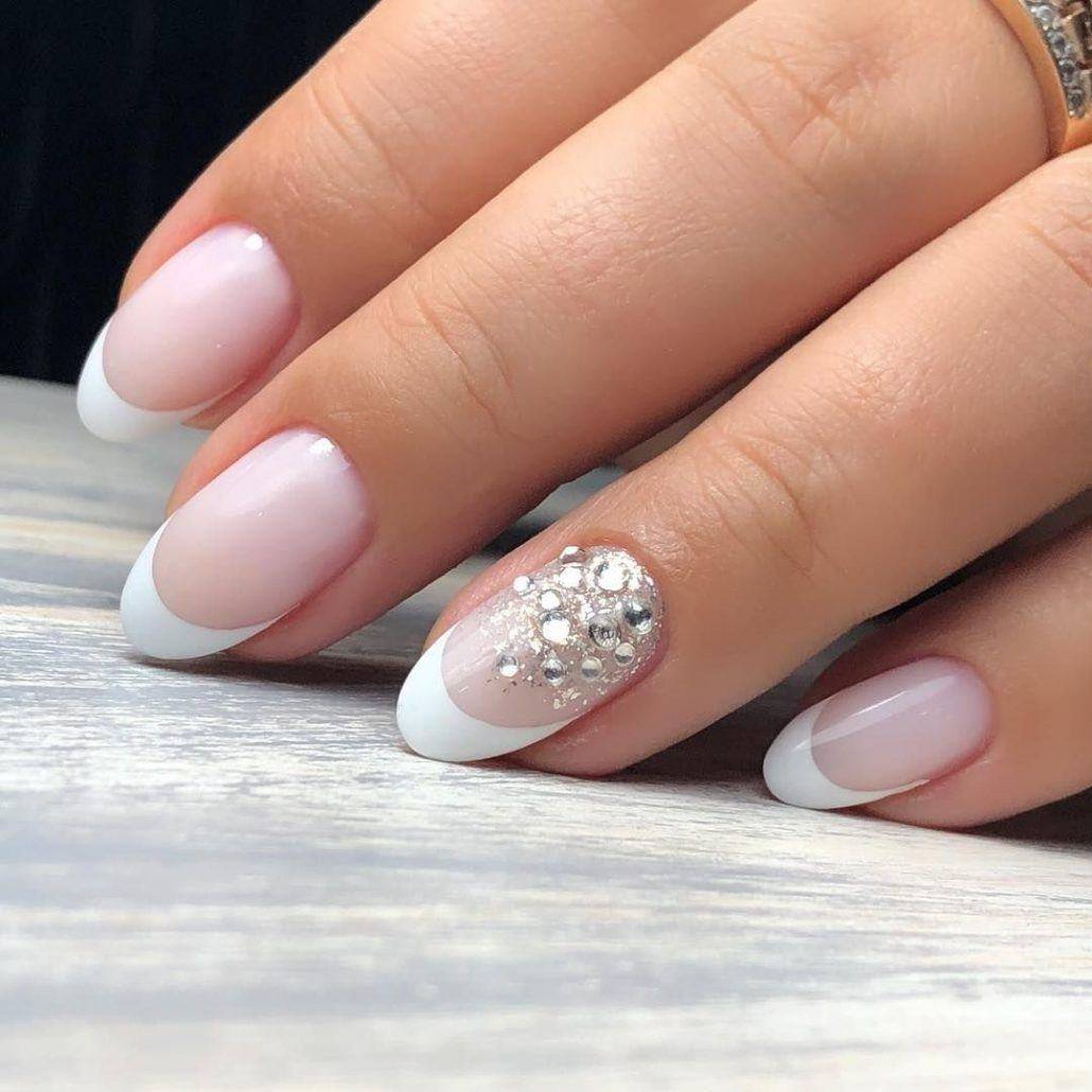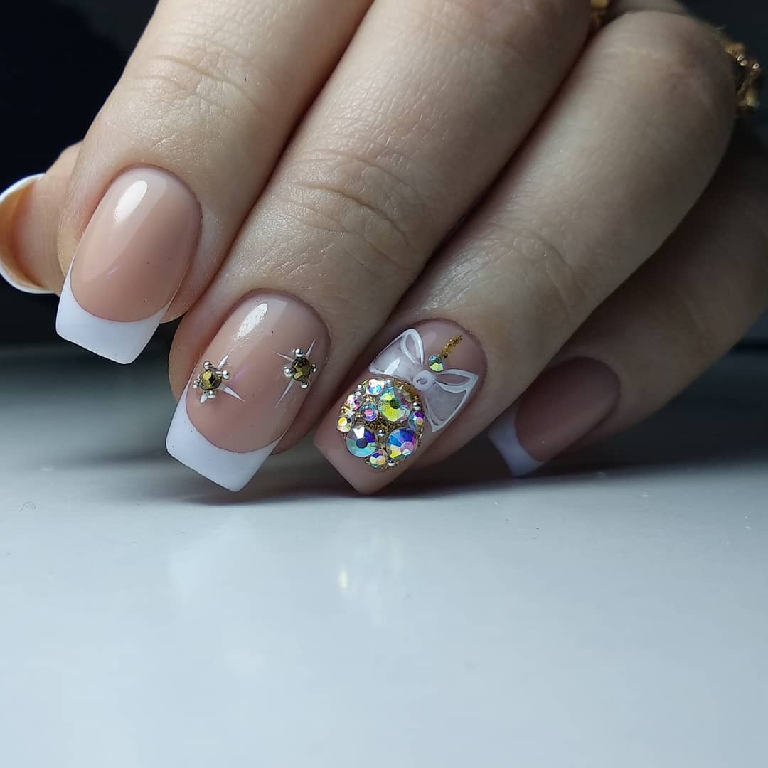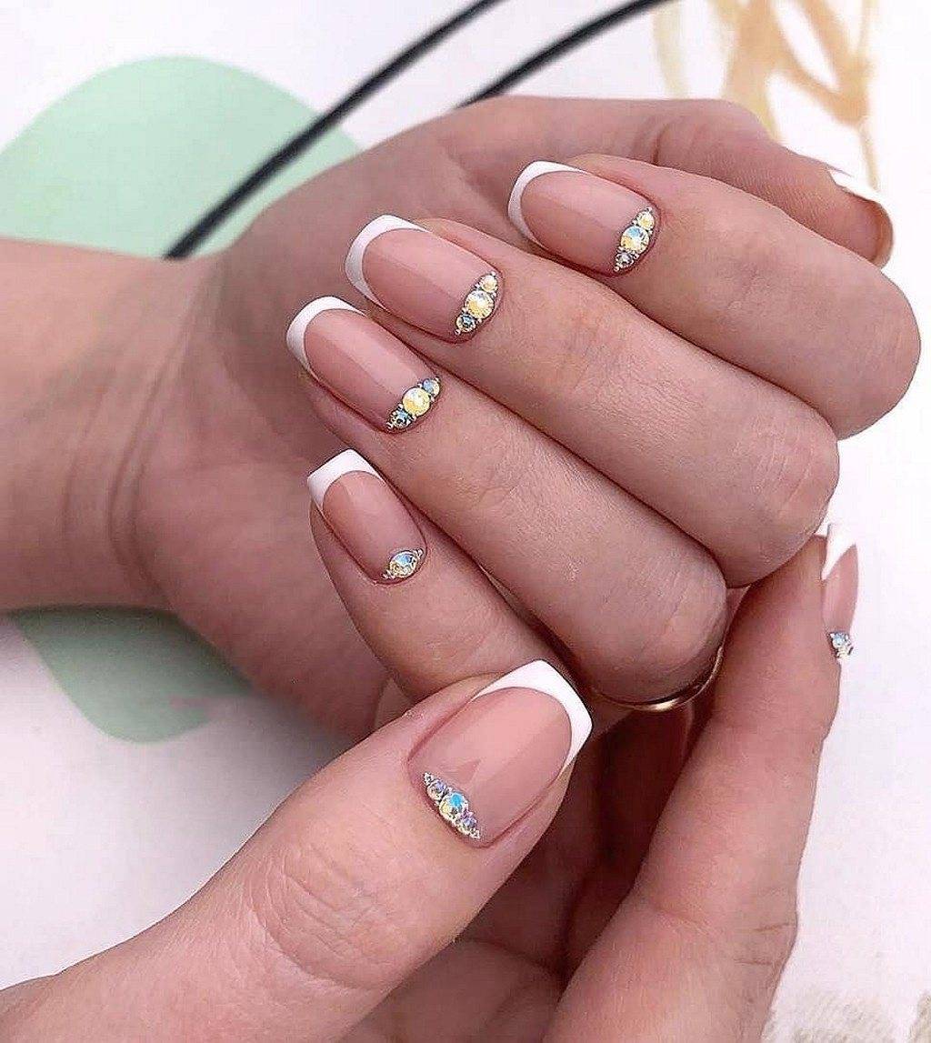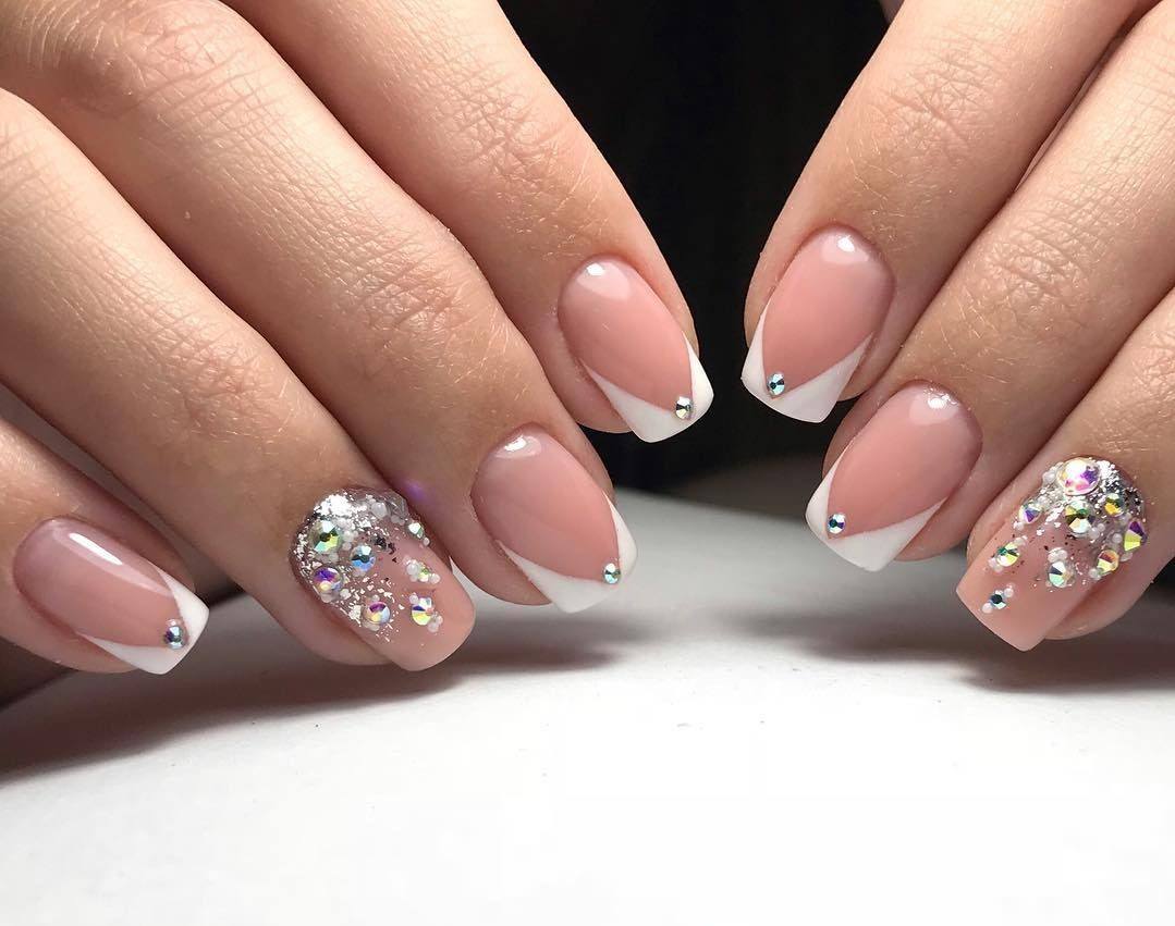 Свадебный френч невесте со стразами добавит немного шика к образу. Изящные ногти с приятными оттенками отлично подчеркнут притягательный блеск камешков.