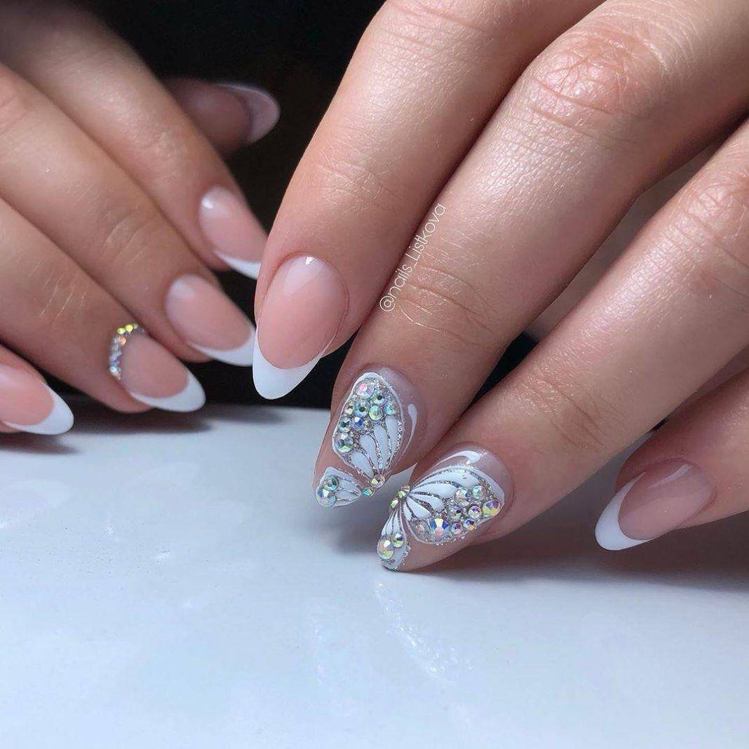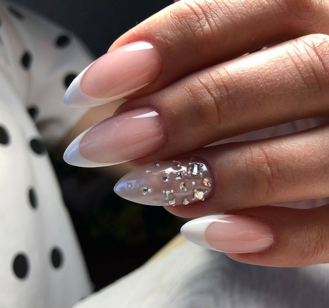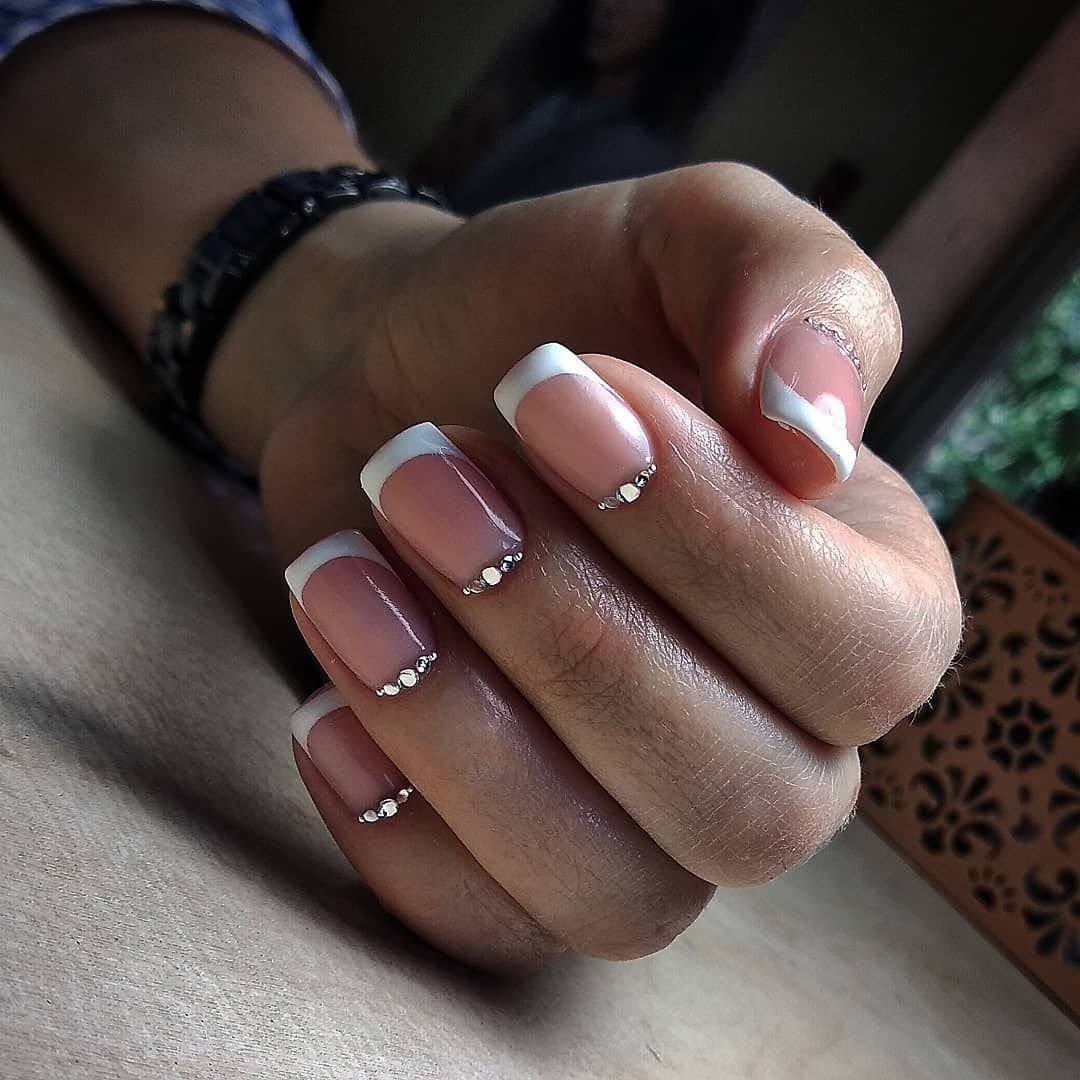 Свадебный френч невесте со стразами добавит немного шика к образу. Изящные ногти с приятными оттенками отлично подчеркнут притягательный блеск камешков.