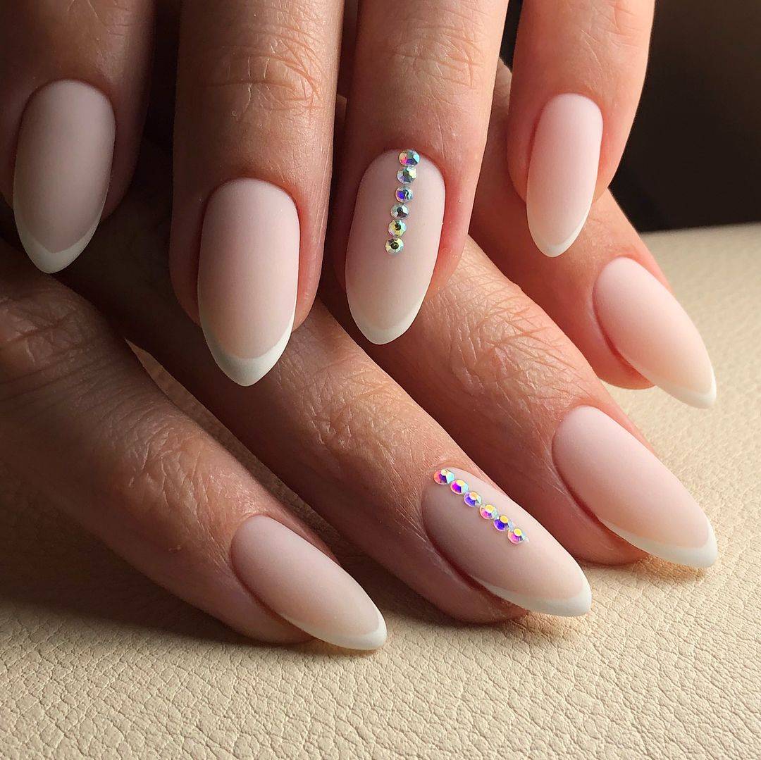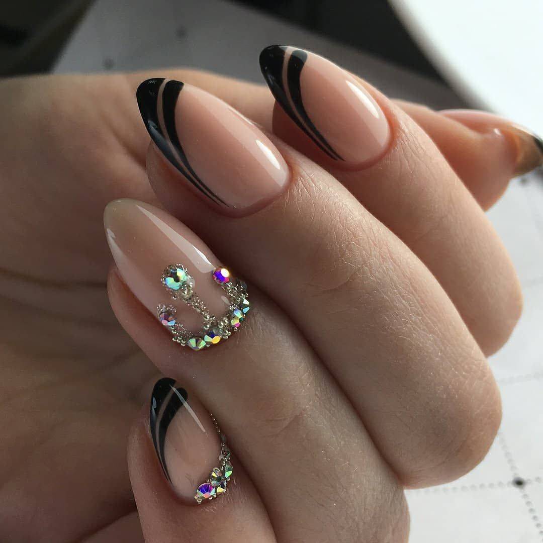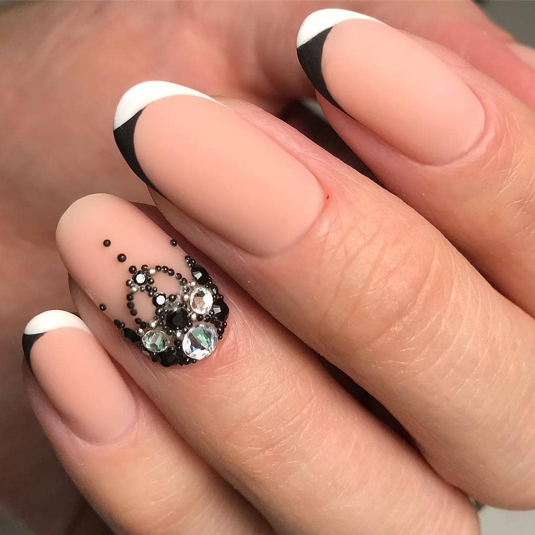 Красиво и элегантно выглядит матовый черный френч со стразами. Дизайн смотрится привлекательно на квадратных, овальных и миндалевидных ногтях. Эти лаконичные формы помогают создать нежные и аккуратные нейл-арты, которые не нуждаются в дополнительном декоре, помимо страз.