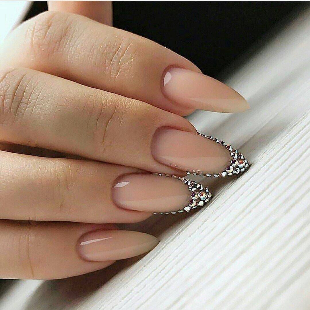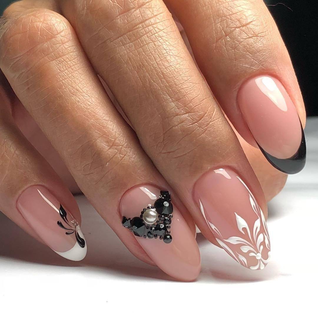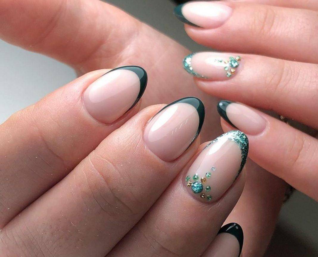 Красиво и элегантно выглядит матовый черный френч со стразами. Дизайн смотрится привлекательно на квадратных, овальных и миндалевидных ногтях. Эти лаконичные формы помогают создать нежные и аккуратные нейл-арты, которые не нуждаются в дополнительном декоре, помимо страз.