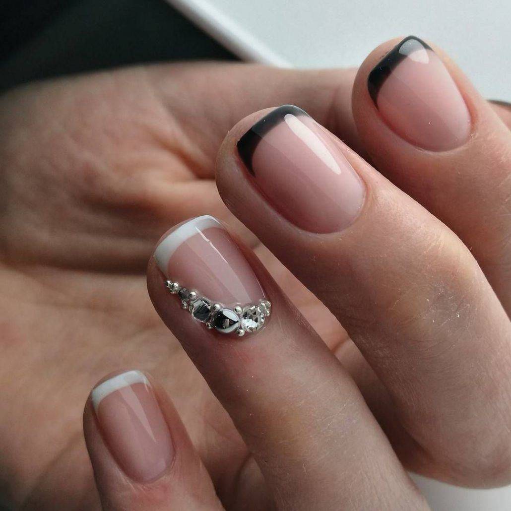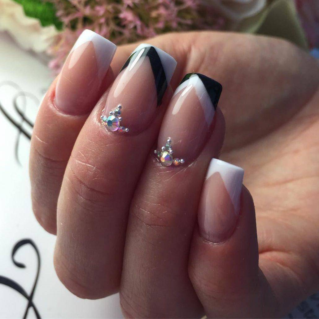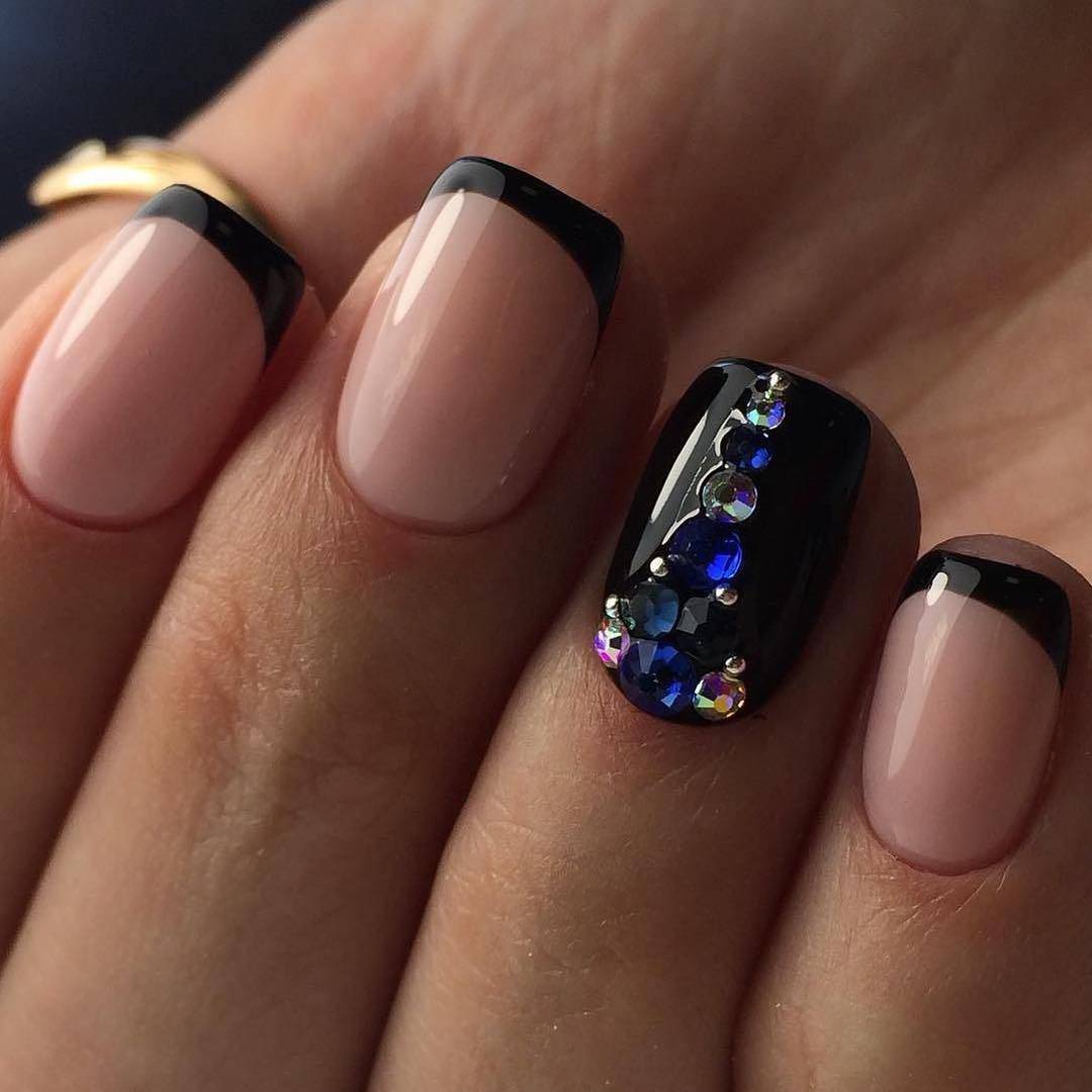 Не смотря на всю свою глубину и некую мрачность, чёрный во французской технике смотрится очень красиво и утончённо. Использование такого цвета в маникюре всегда подразумевает его дополнительное декорирование, и стразы, в нашем случае, актуальны в оформлении как никогда. Наилучшим местом для расположения украшений, по-прежнему, остаётся линия улыбки или прикорневая область ноготка. Изысканно и очень элегантно смотрится чёрный матовый френч со стразами. В этом примере можно дополнительно покрыть несколько ноготков бархатистым топом полностью или поиграть с формой улыбки. Попробуйте оформить на ногтях двойную или скошенную вариация френча. Вы будете приятно удивлены, насколько свежо и оригинально может выглядеть чёрный цвет в маникюре.