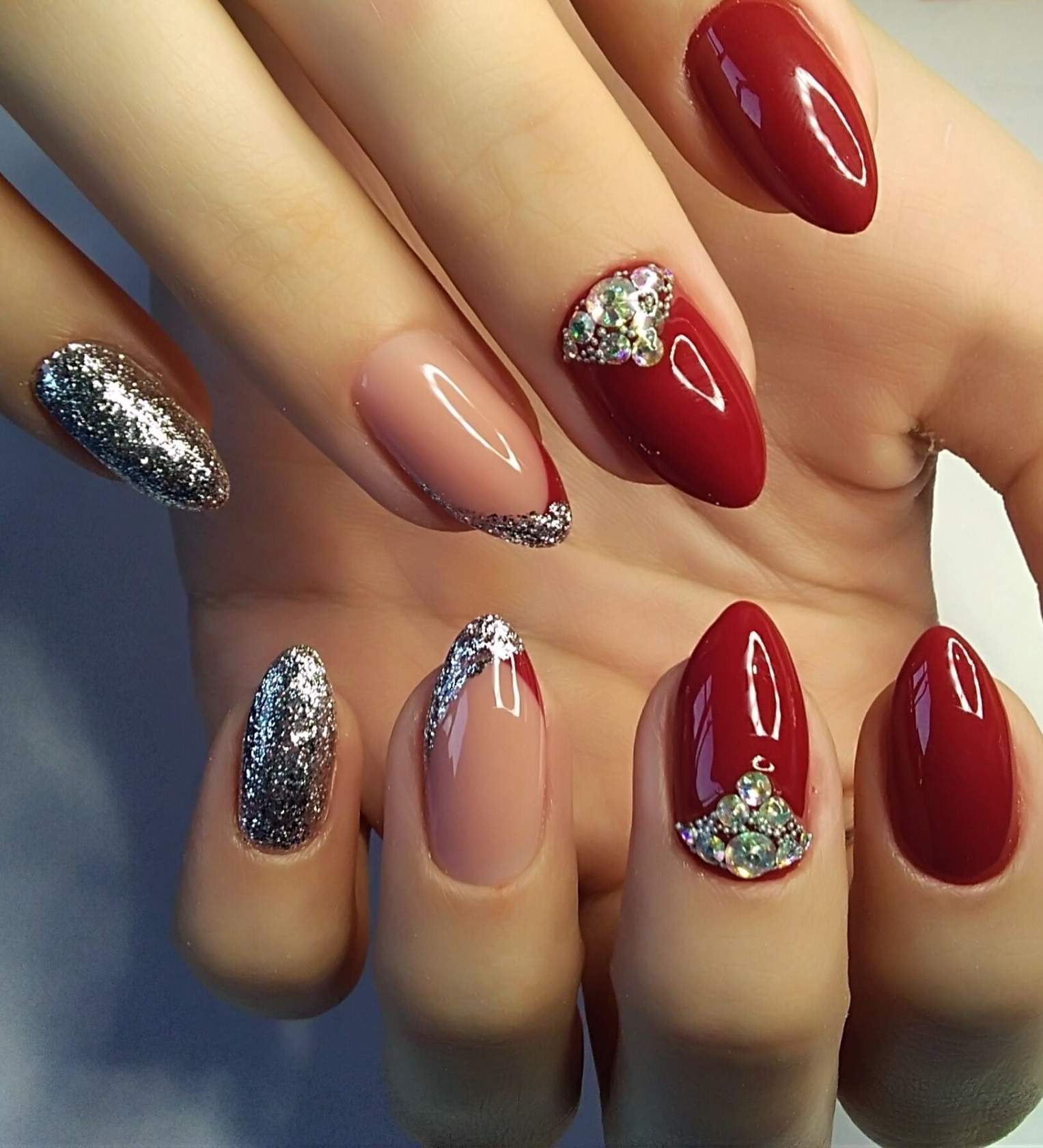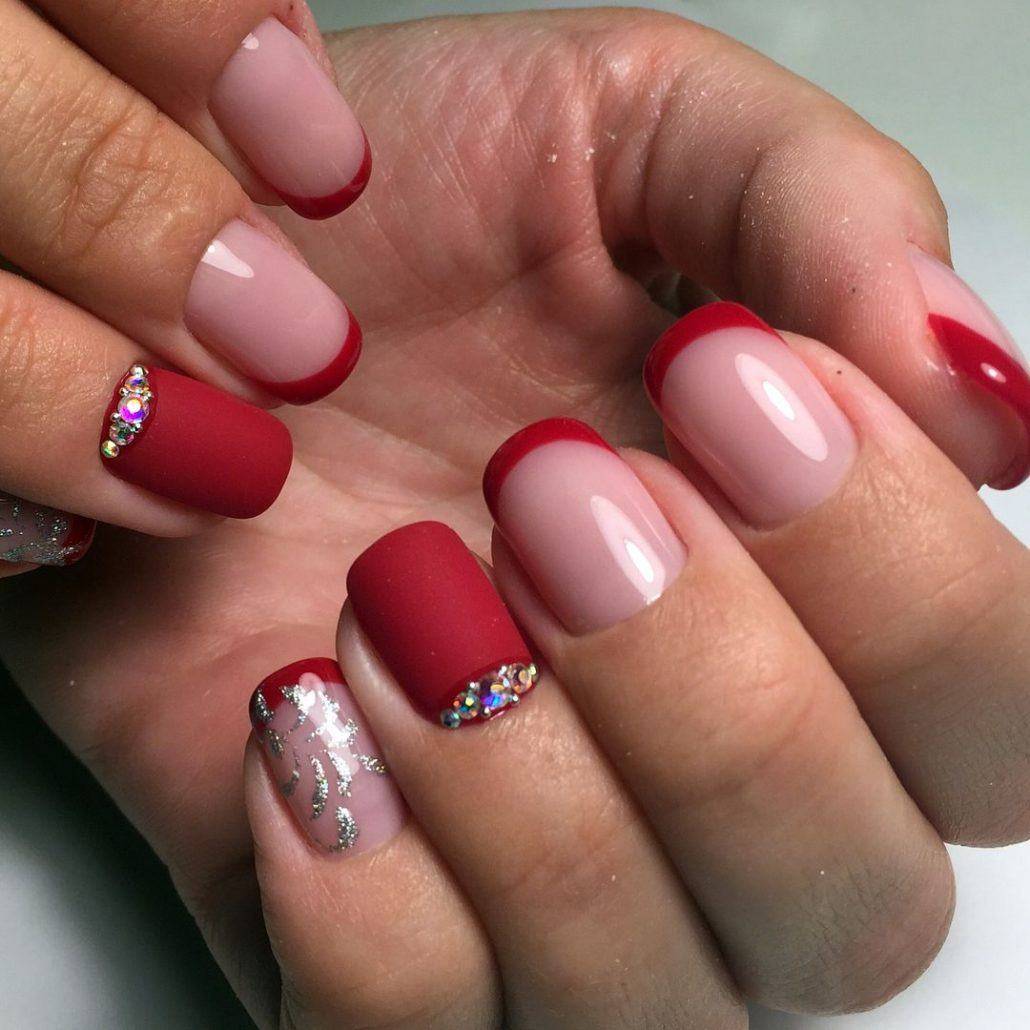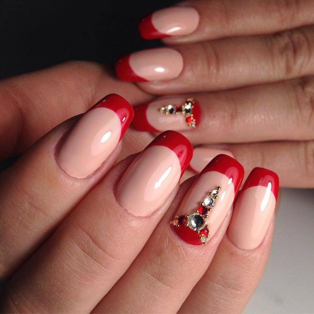 Для маникюра в красных тонах подойдут стразы серебристые, чёрные или красные, близкие по оттенку к самому тону лака. С тёплыми томатными оттенками ярко смотрятся белые, синие (морской стиль) и чёрные стразы. Актуален френч на алом лаке с чёрным кружевом, красными, золотистыми и чёрными стразами.
