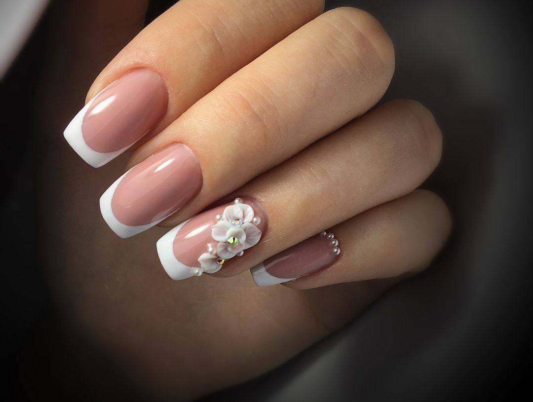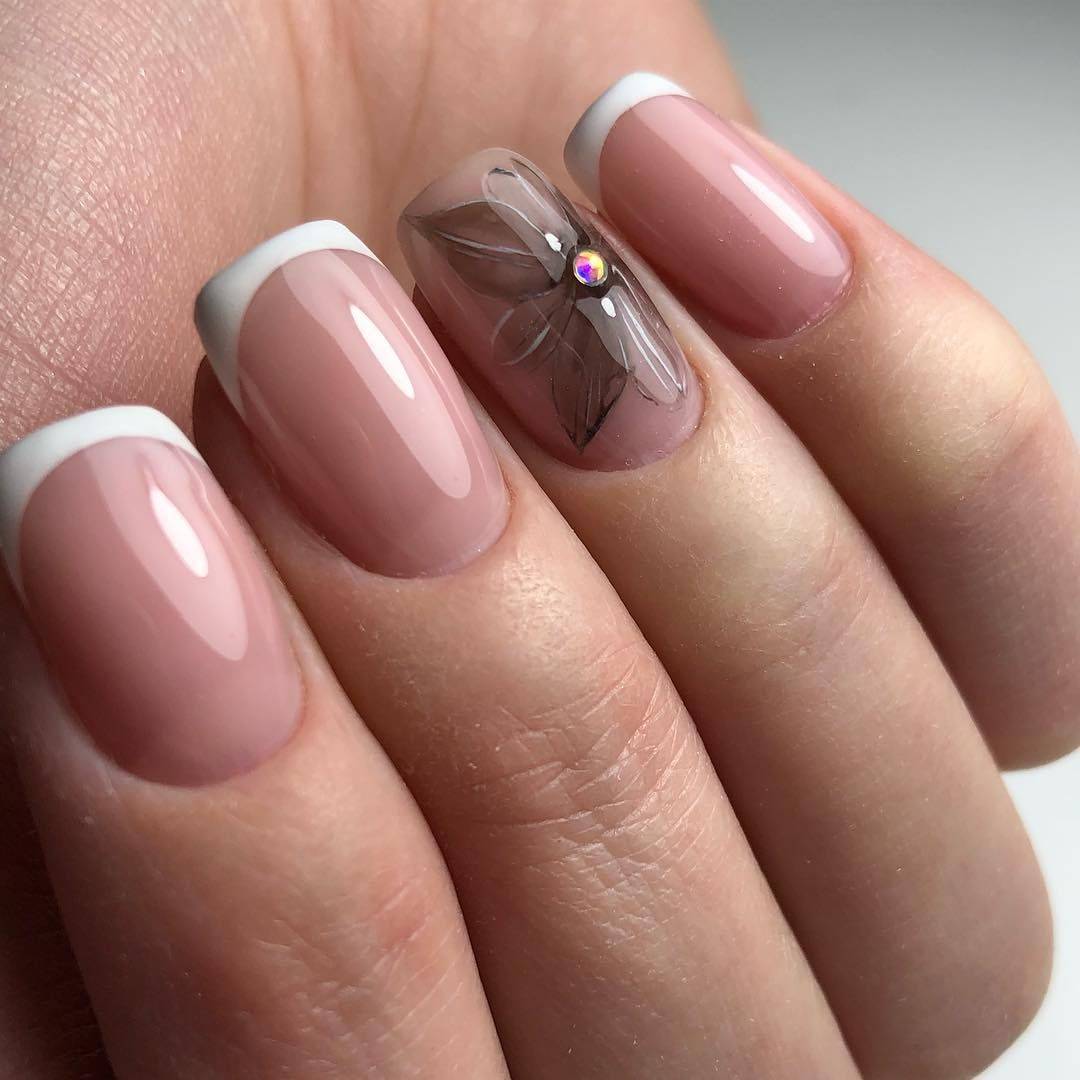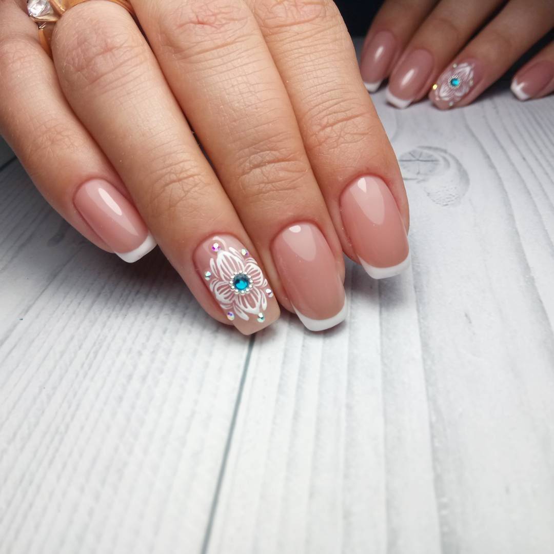 Он всегда смотрится привлекательно, независимо от времени года и дополнительного украшения. Именно поэтому его выбирают многие невесты для столь долгожданного праздничного дня. Конечно же, в данном случае заранее стоит обговорить все нюансы, чтобы в день свадьбы все прошло идеально. Чаще всего линию улыбки оформляют белым цветом и лишь на нескольких ноготках допустимо наносить рисунки. Это могут быть кружевные вставки, абстракция или же цветочный принт. В сочетании со стразами такой маникюр будет выглядеть потрясающе красиво.